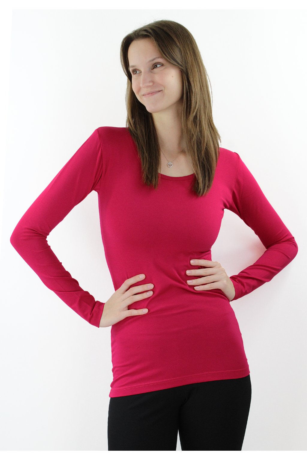 Dámské prodloužené vyštíhlené triko s kulatým výstřihem v krásném sytém malinovém odstínu je ušito z pružného, příjemného materiálu. Triko má nadčasový univerzální střih a dá se kombinovat s čímkoliv a rozhodně Vám v něm bude teplo na záda :-) Triko drží tvar a nepřetáčí se ve švech.
