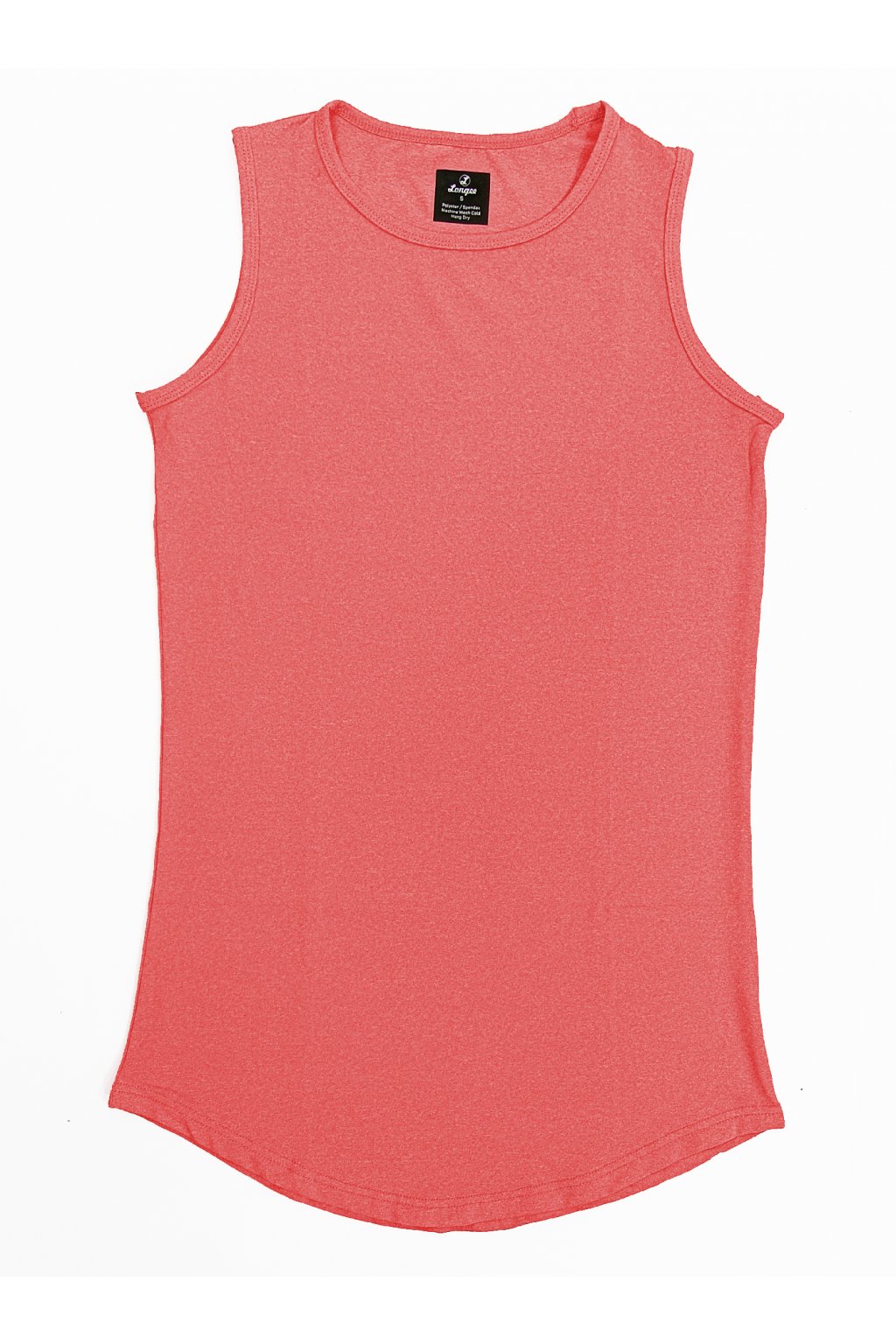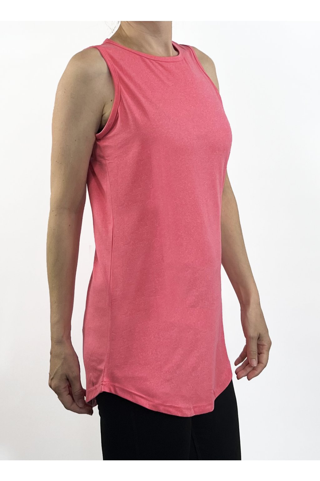 Dámské prodloužené fitness triko je ušito z příjemného hebkého materiálu v lososovém melírovaném odstínu a má funkční vlastnosti. Triko je bez rukávů a dolní část je tvarovaná do oblouku.