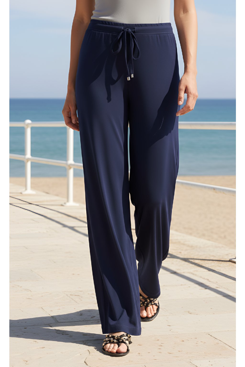 Dámské lehké letní kalhoty z příjemné splývavého materiálu v tmavomodrém odstínu, který se nemačká a v létě krásně chladí. V pase mají gumu a stahovací šňůrku. Nohavice jsou bez vnějších bočních švů.