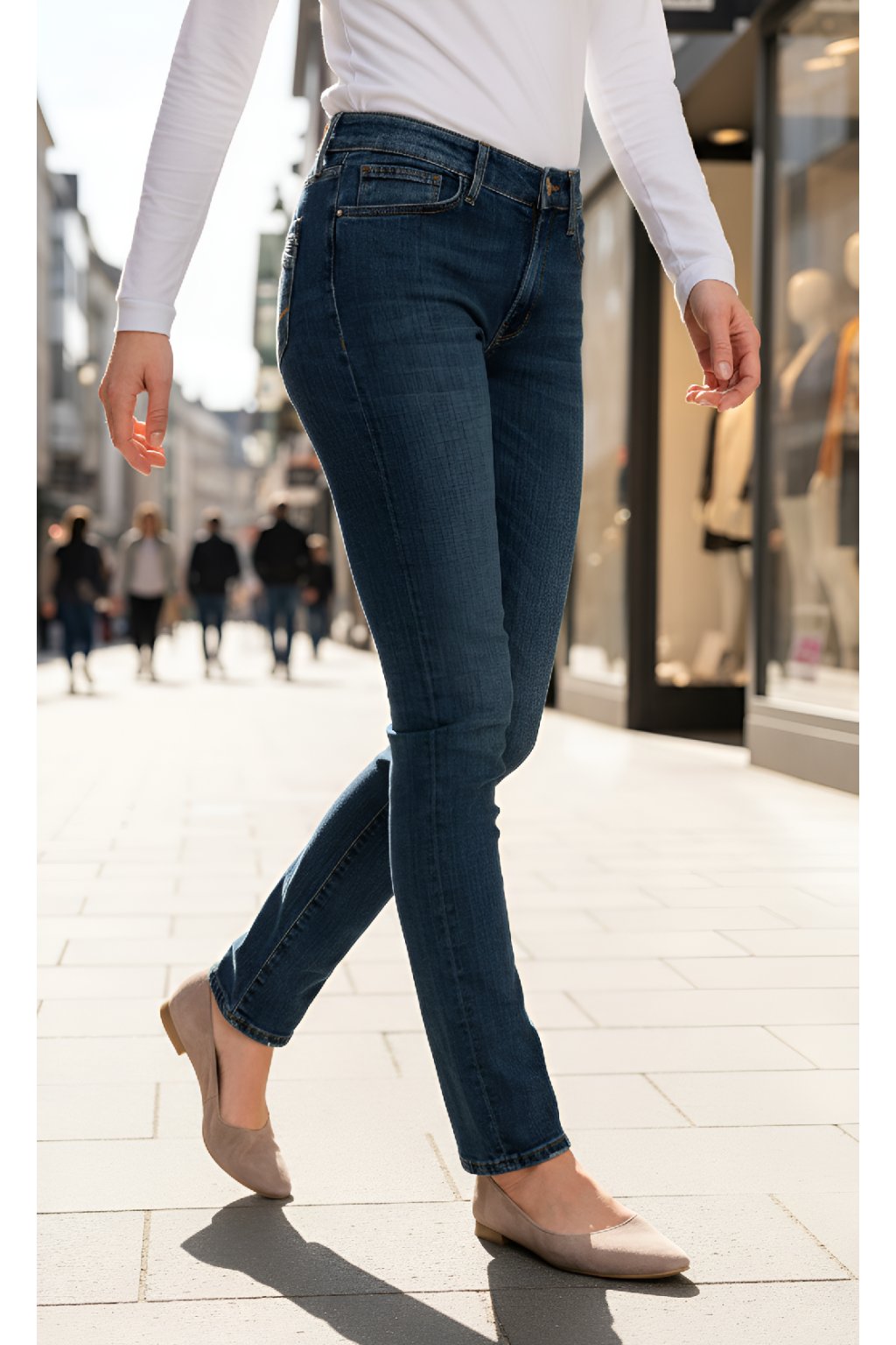 Dámské prodloužené populární modré džíny Anya s úzkými nohavicemi a vysokým sedem, které krásné obepínají postavu a lichotí jejím křivkám. Džíny jsou ušity z pružného materiálu a vydržíte v nich celý den! Džíny jsou prošité efektní hnědou nití.