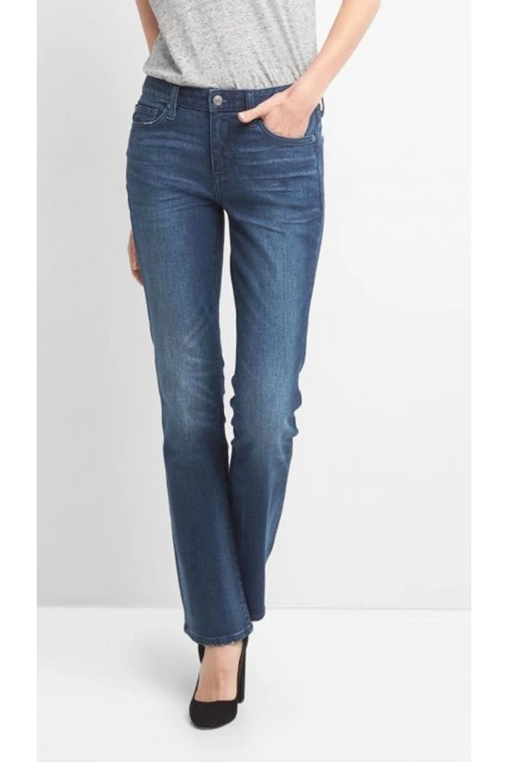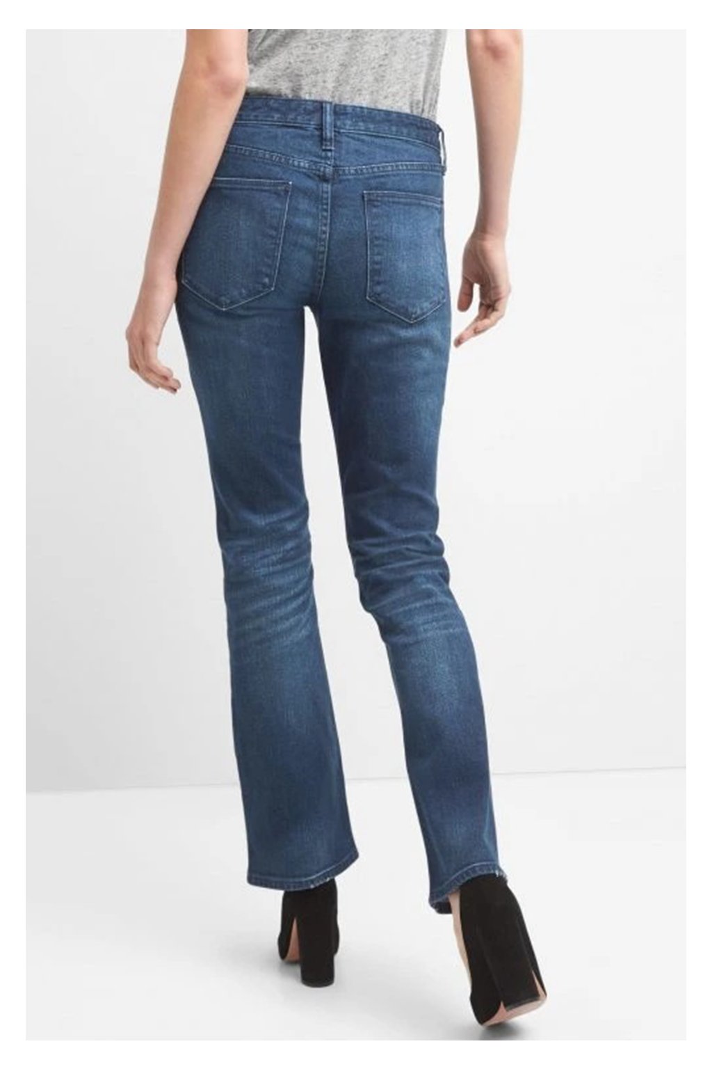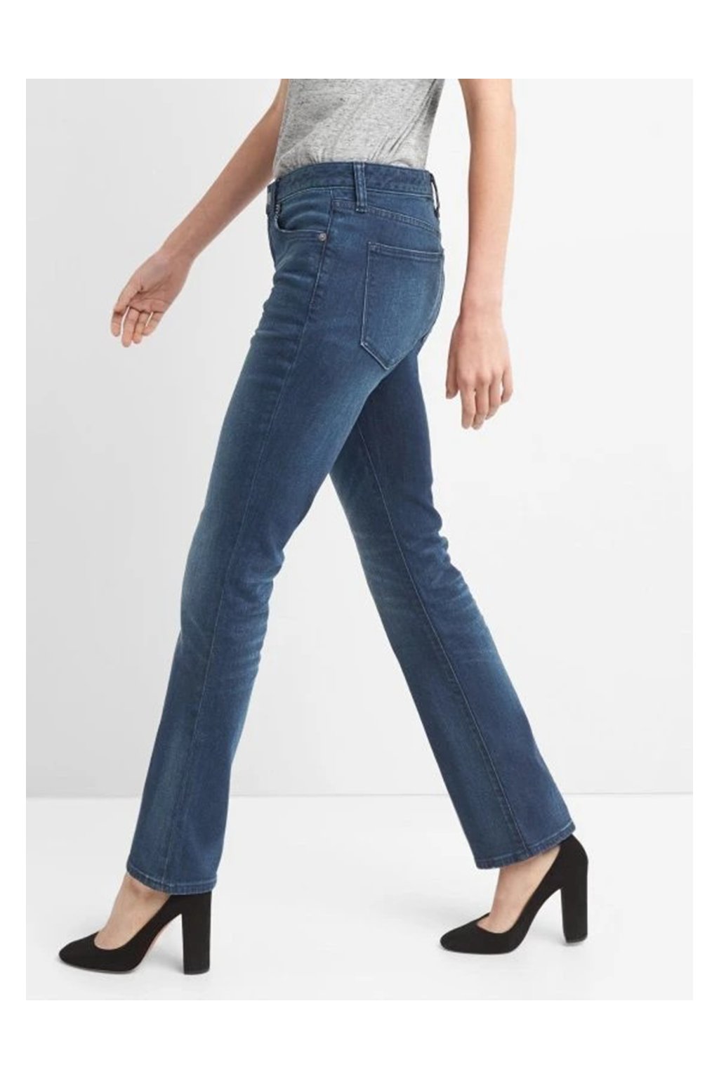 Dámské prodloužené klasické džíny rovného střihu s mírně rozšířeným lemem nohavic, z pevnějšího a silnějšího materiálu, který mírně pruží. Sed je spíše vyšší, a proto kalhoty pěkně sedí. Na stehnech a kapsách mírně seprané.