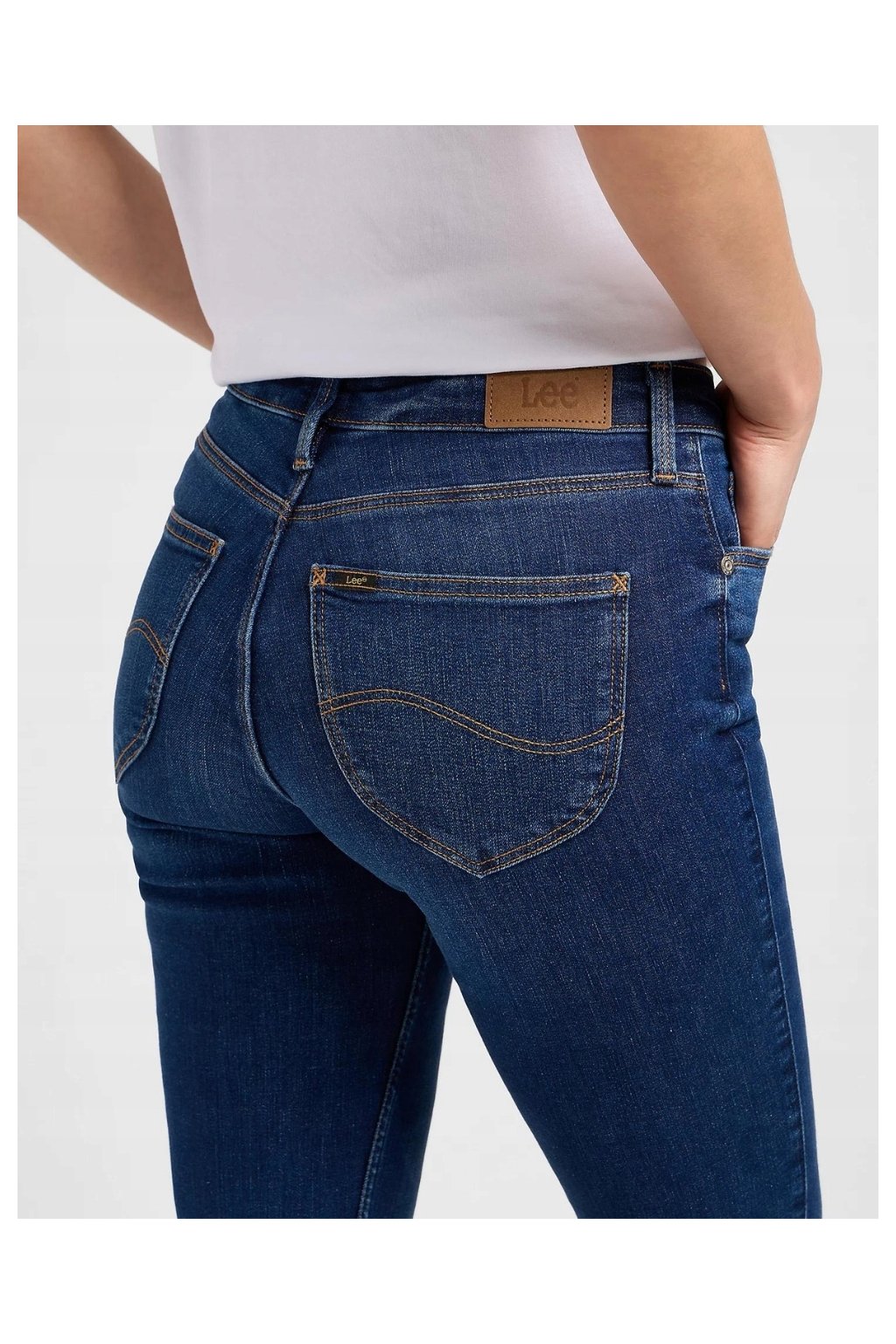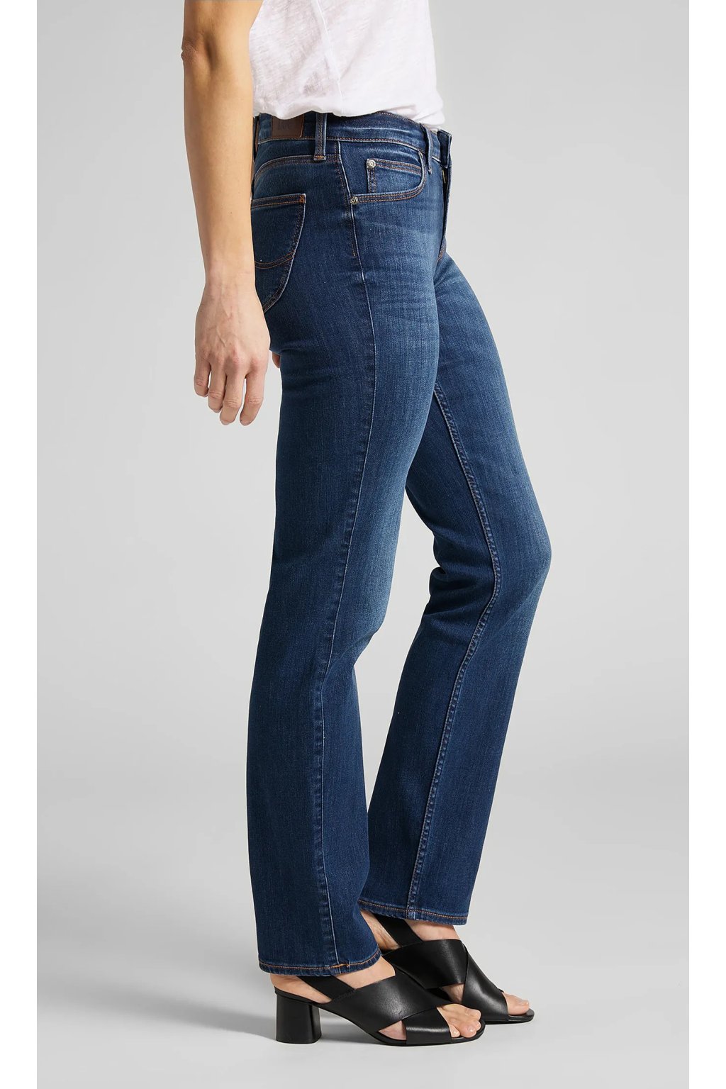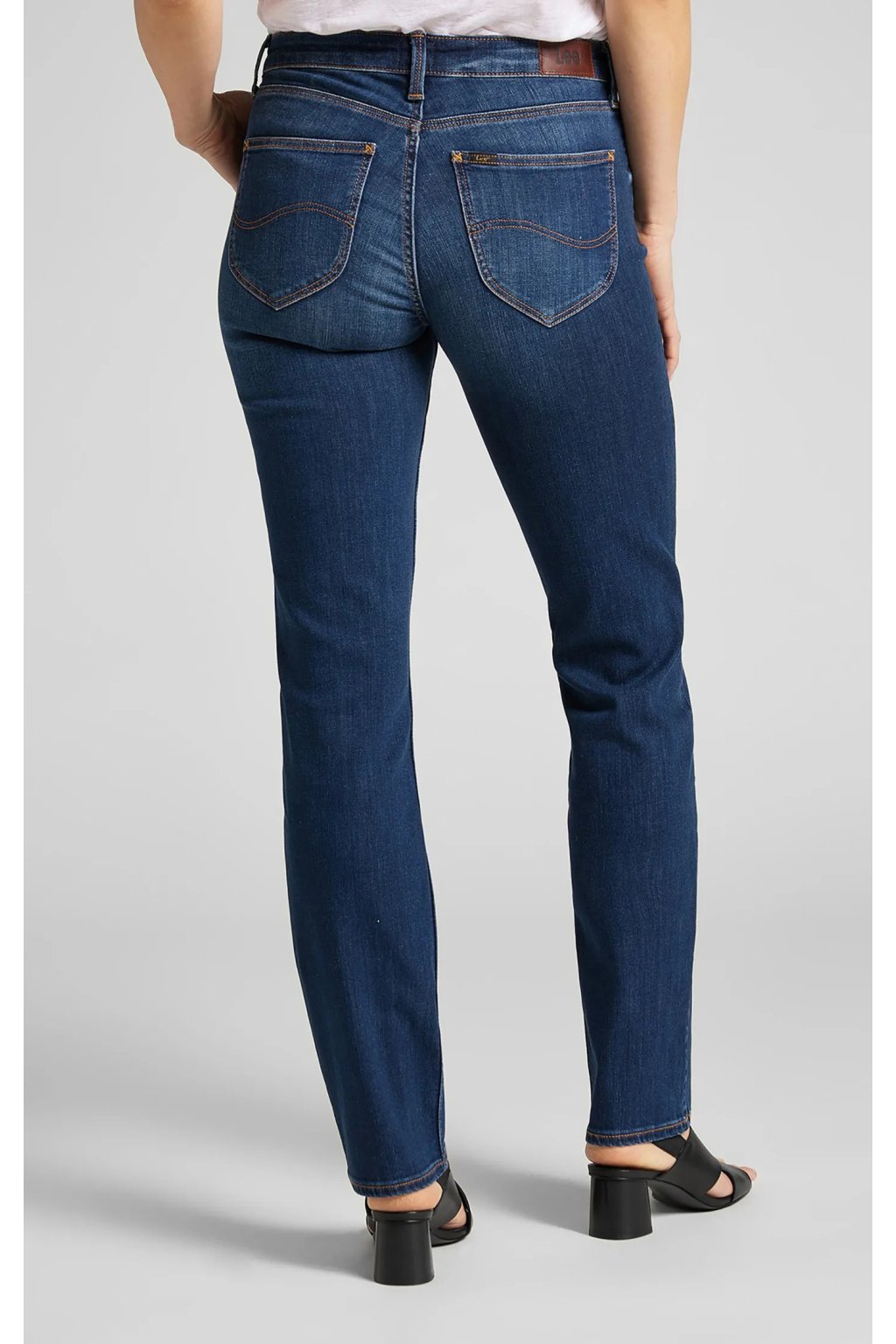 Rovně střižené dámské prodloužené džíny jsou z velmi příjemného, silnějšího a pružného materiálu. Oranžové prošití oživuje tmavěmodrou barvu látky. Pas je vyšší a kalhoty velmi pěkně přiléhají v horních partiích.