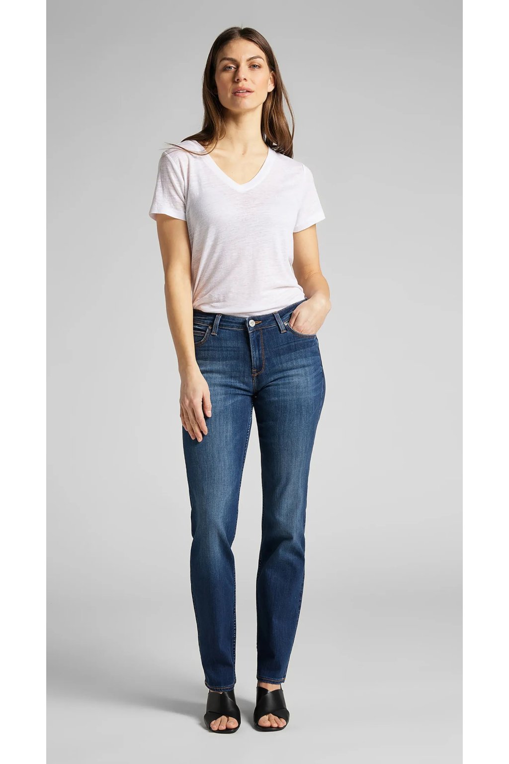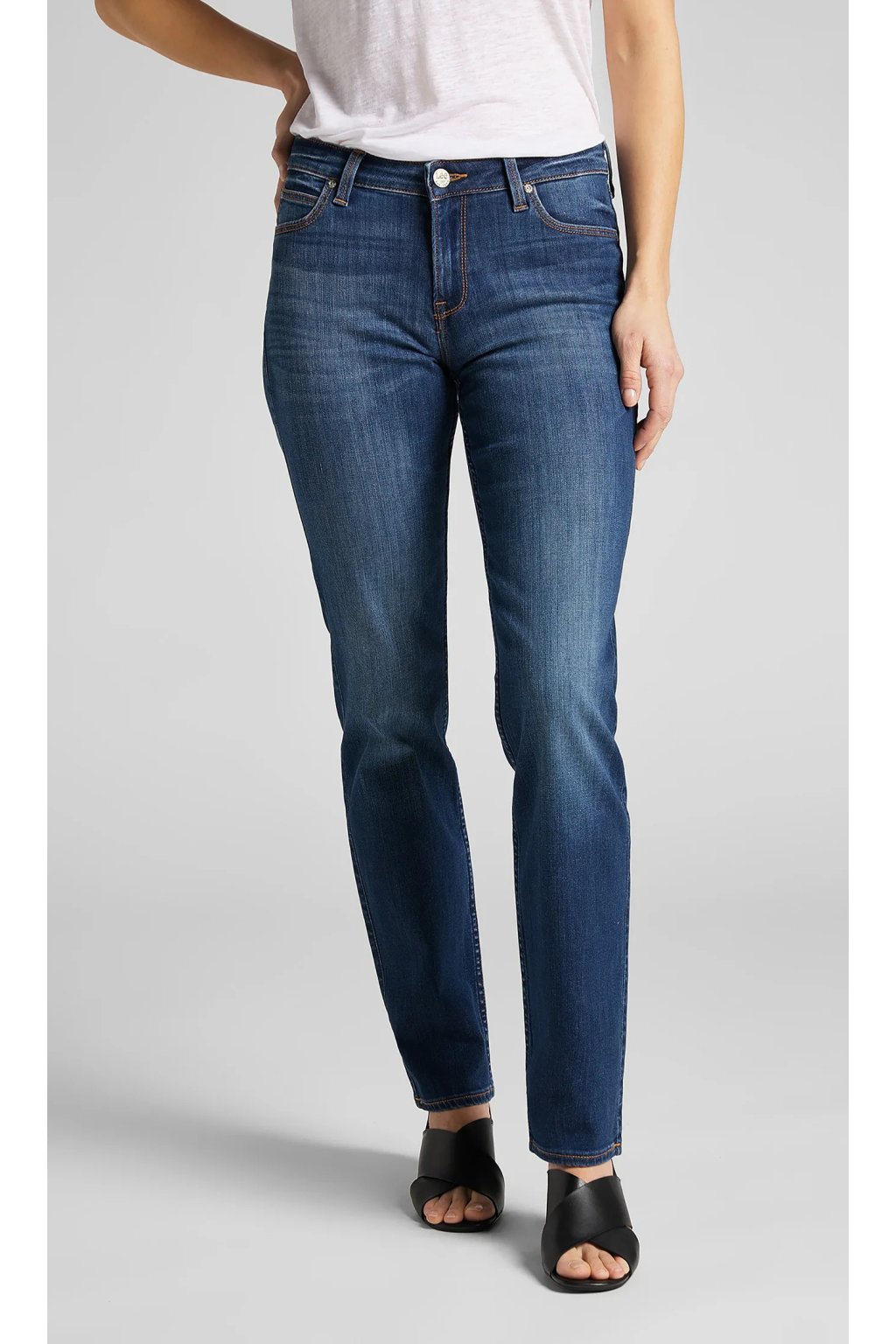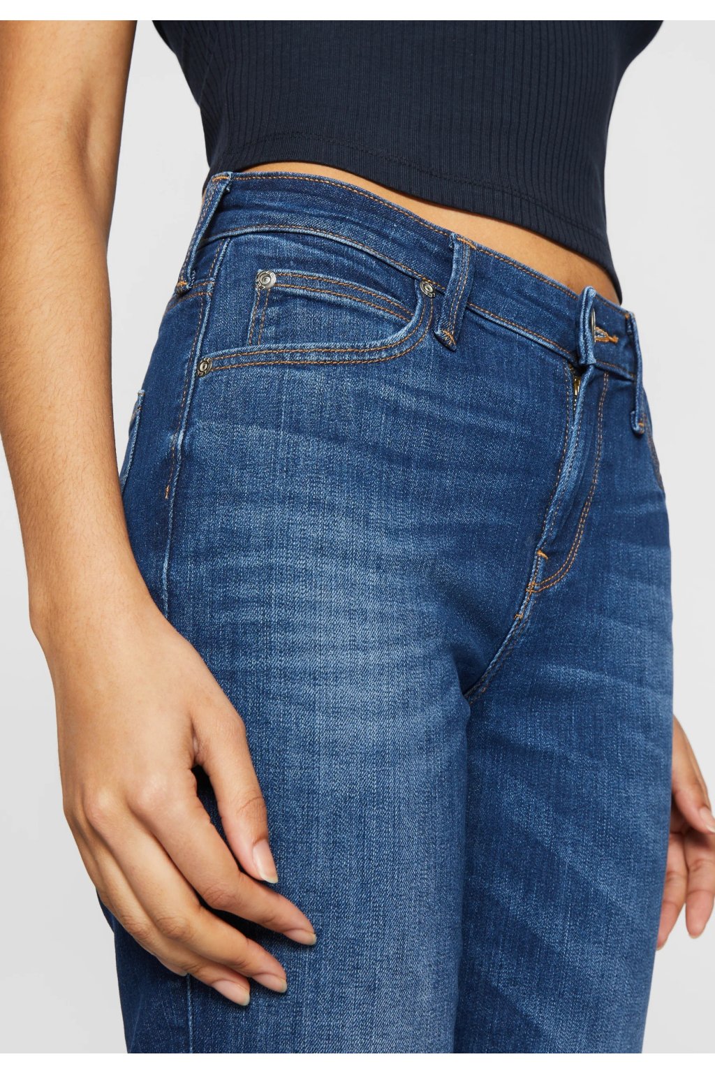 Rovně střižené dámské prodloužené džíny jsou z velmi příjemného, silnějšího a pružného materiálu. Oranžové prošití oživuje tmavěmodrou barvu látky. Pas je vyšší a kalhoty velmi pěkně přiléhají v horních partiích.