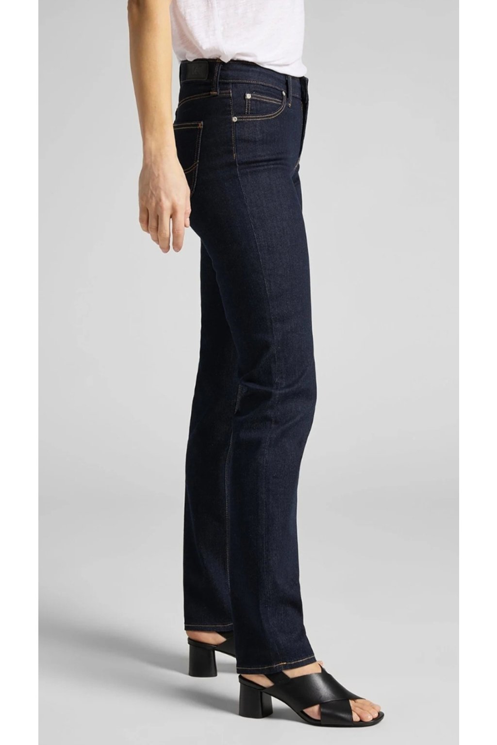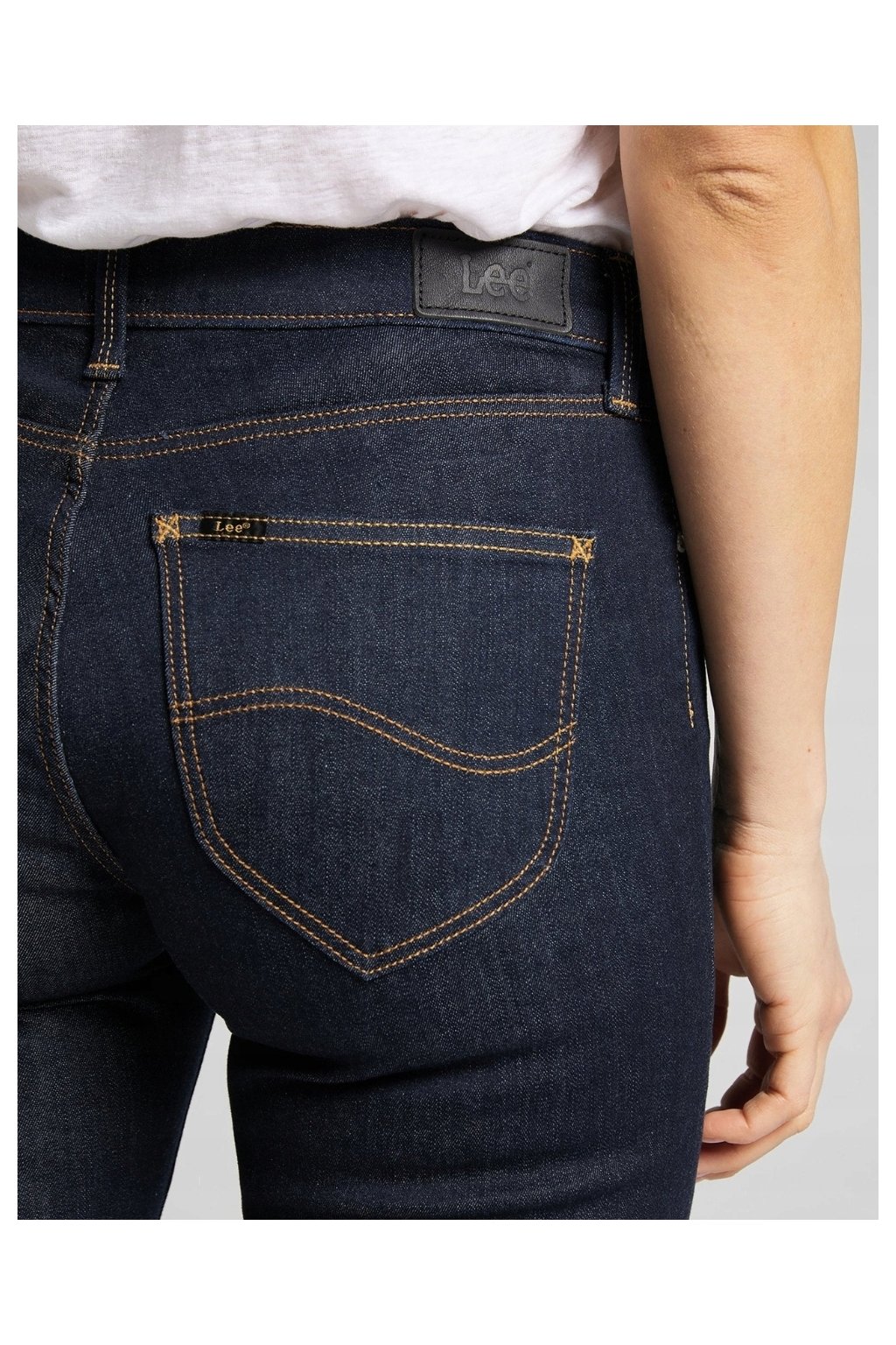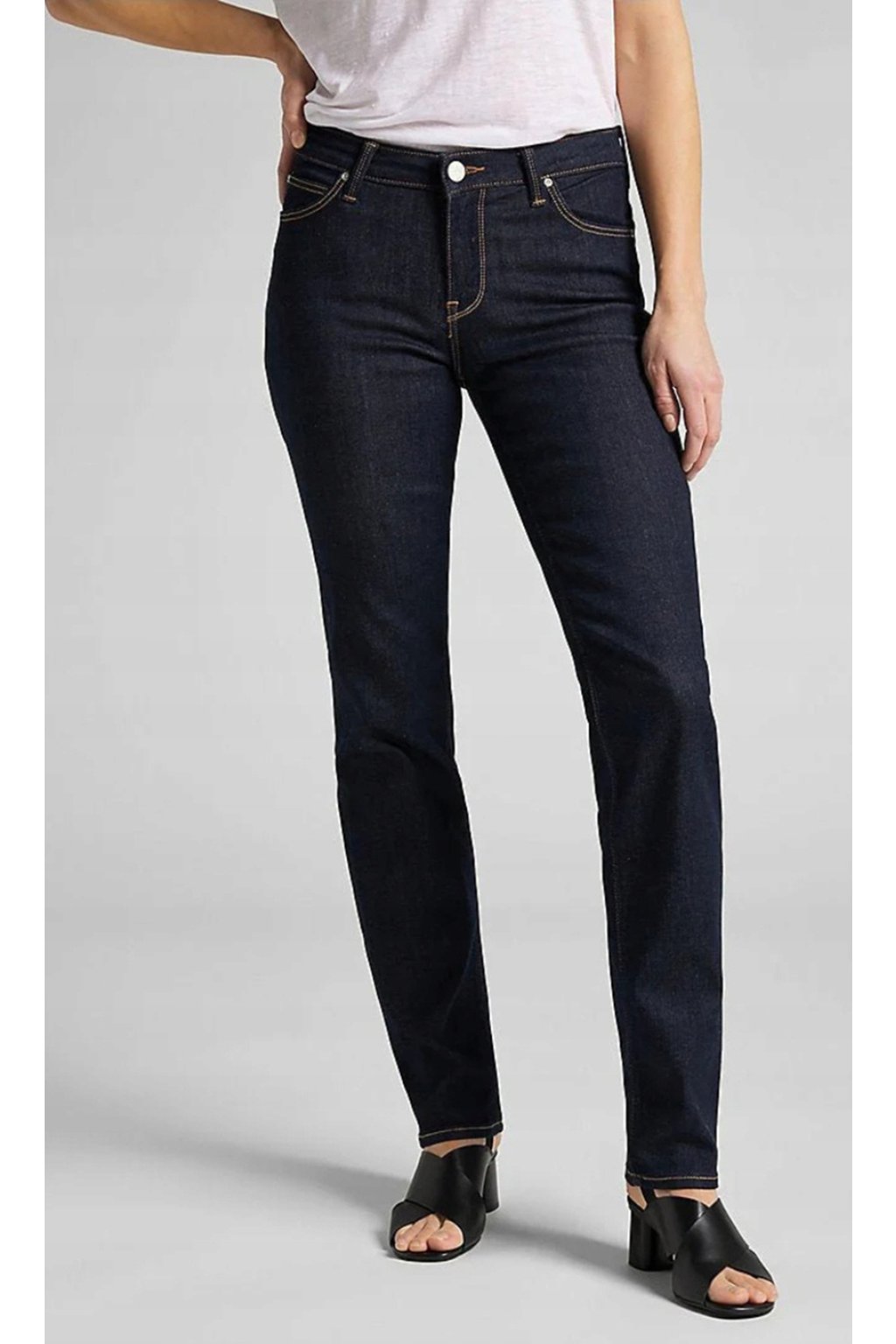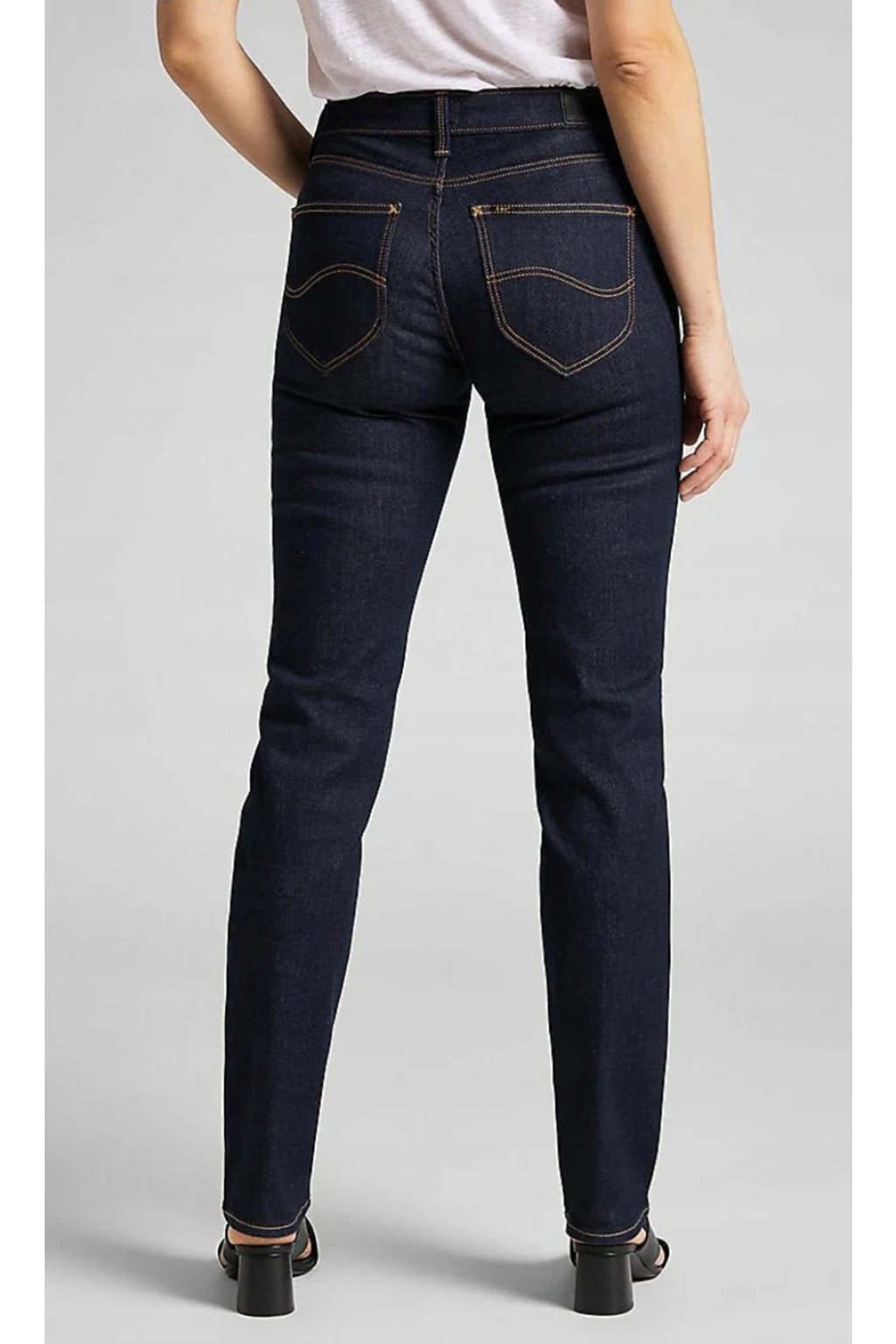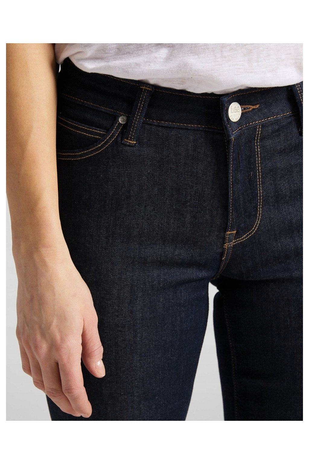 Tmavě modré, rovně střižené dámské prodloužené džíny s výrazným oranžovým prošitím a stříbrnými cvočky i knoflíkem upoutají pozornost svým typicky denimovým stylem. Materiál příjemně pruží, pas je středně vysoký.