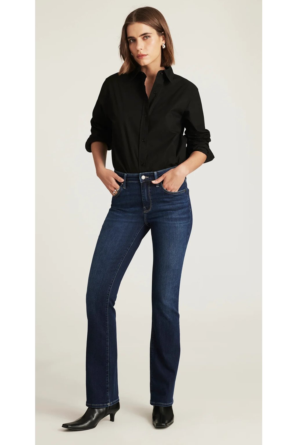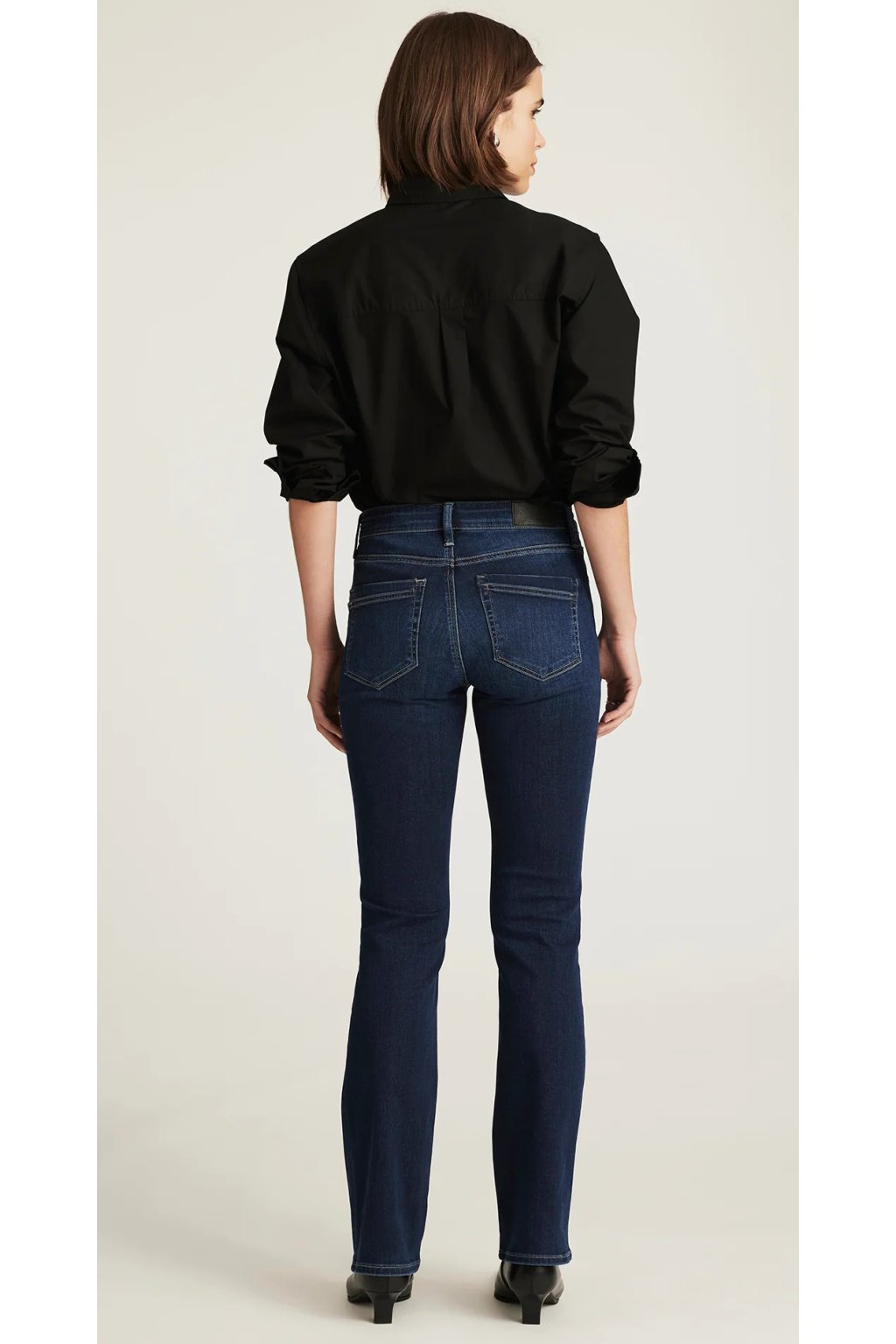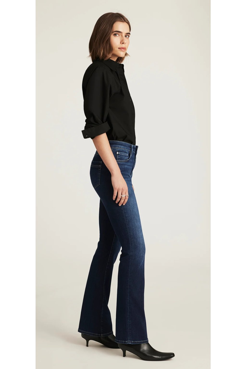 Dámské prodloužené džíny Maria jsou ušity z měkké pružné džínoviny v tmavě modrém odstínu s jemnou patinou. Mají středně vysoký pas a a rozšiřující se nohavice. Na přední straně a zadní straně jsou dvě funkční kapsy. Džíny jsou pružné a vytáhnou se, doporučujeme volit o číslo menší velikost.