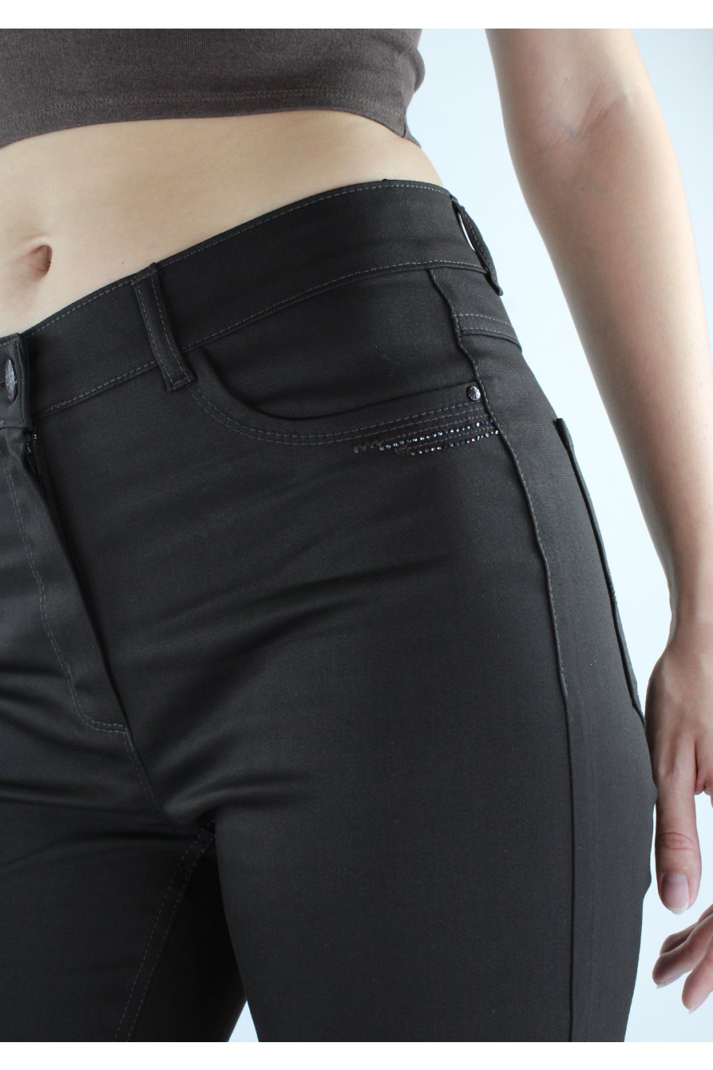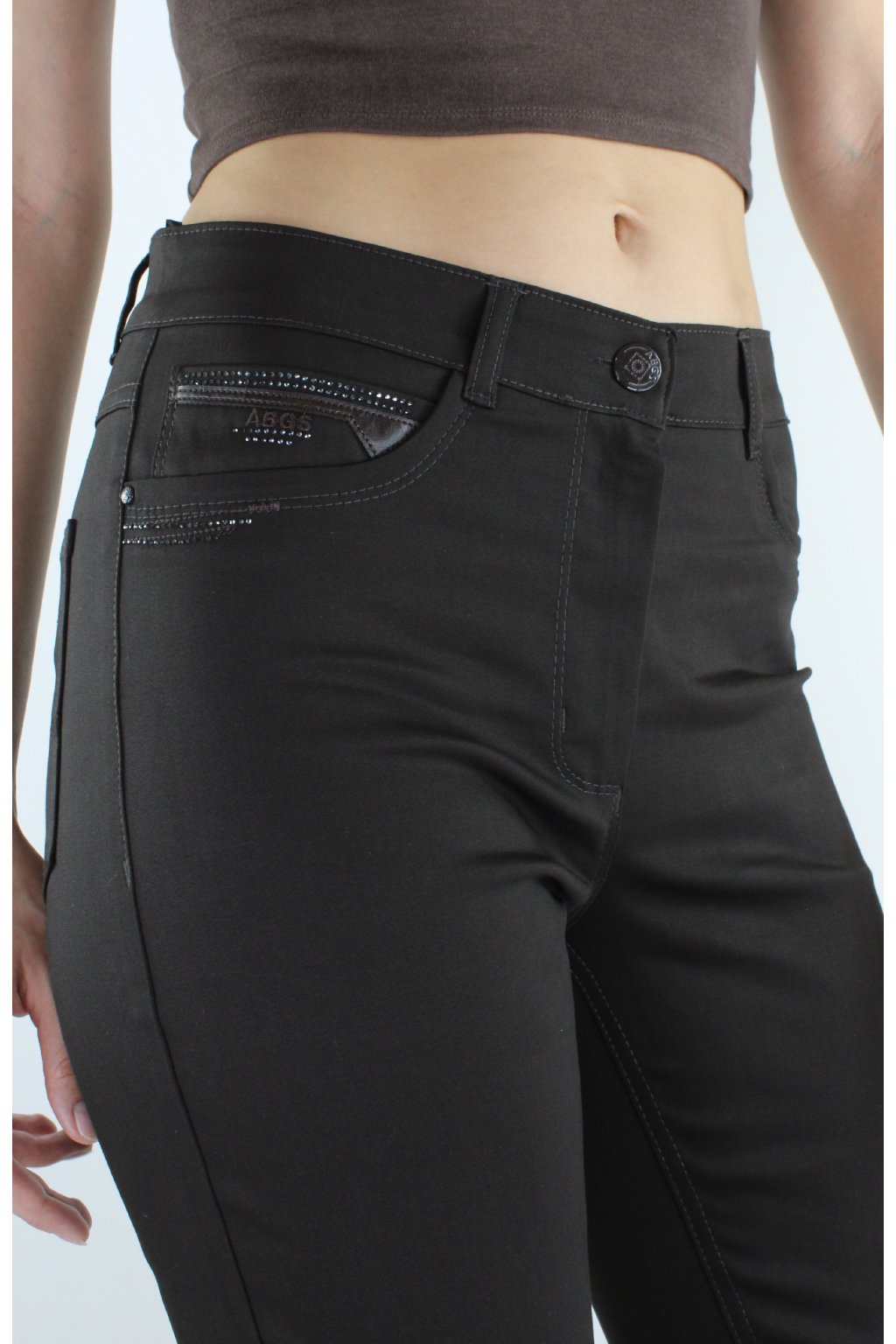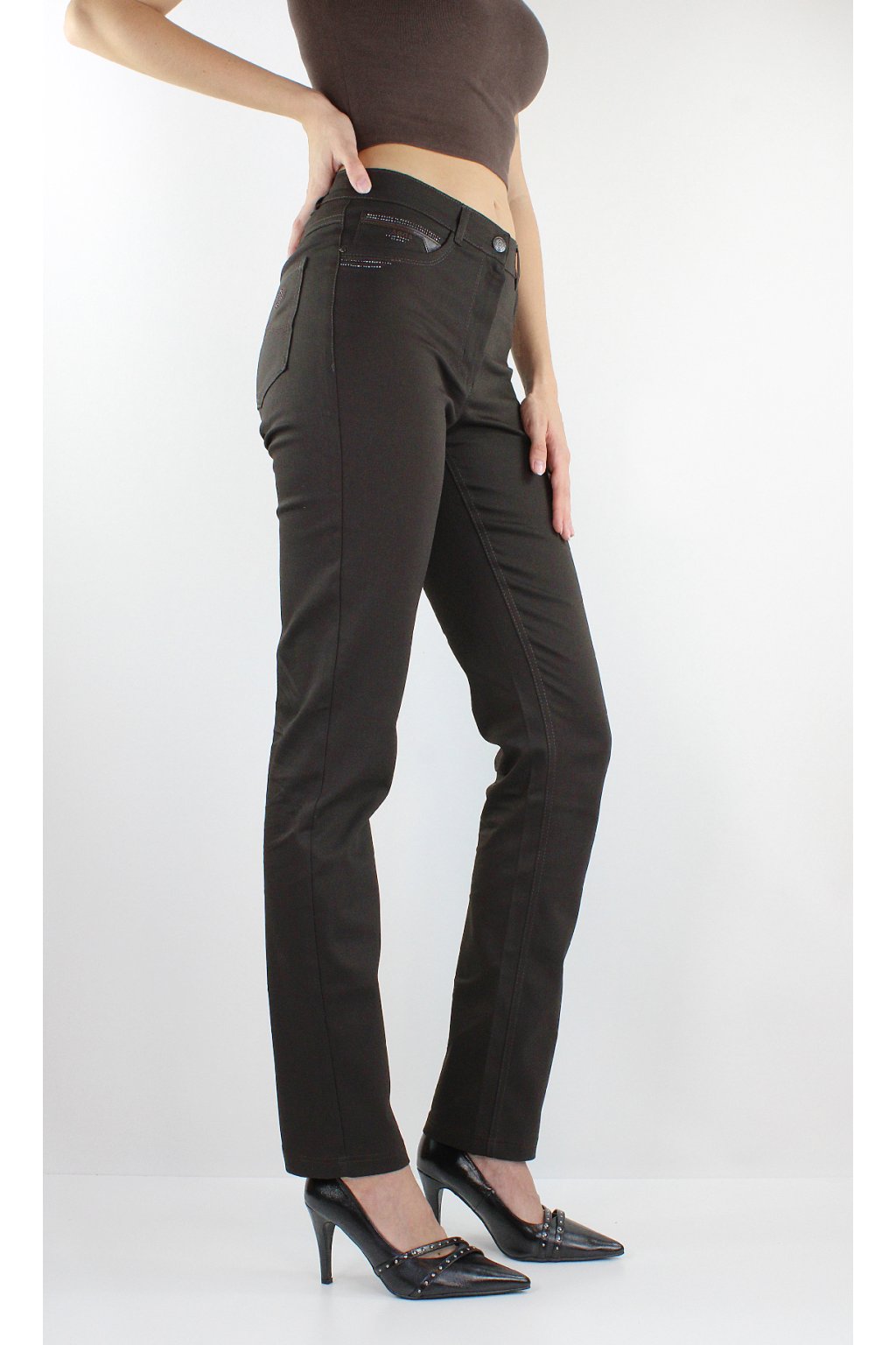 Dámské prodloužené úzké kalhoty BARA v tmavohnědém odstínu jsou ušité ze super pohodlného pružného materiálu, díky němuž v nich vydržíte celý den! Kalhoty mají zajímavě ozdobené lesklými kamínky přední a i zadní kapsy. Zapínání je na zip a dva knoflíky. V pase jsou poutka na uchycení opasku.
