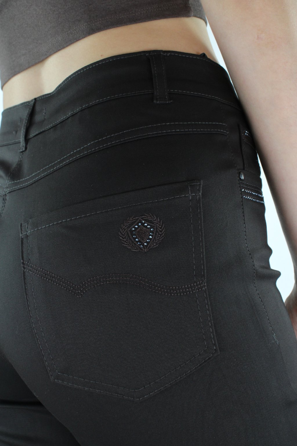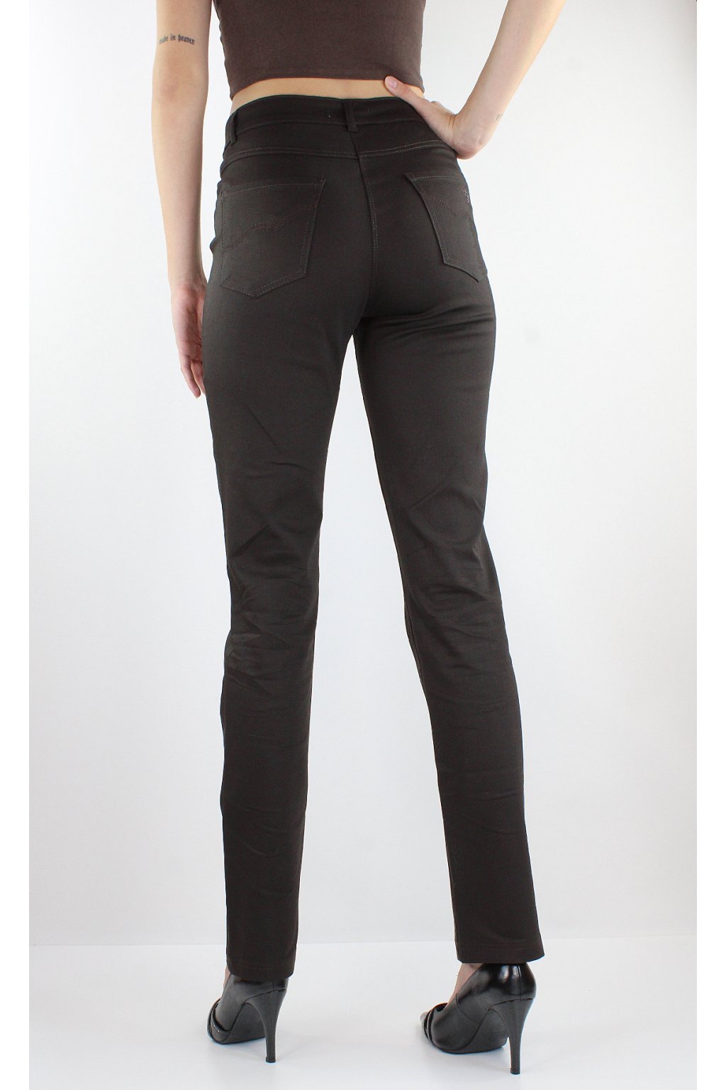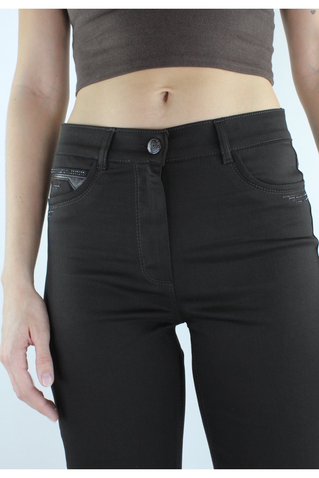 Dámské prodloužené úzké kalhoty BARA v tmavohnědém odstínu jsou ušité ze super pohodlného pružného materiálu, díky němuž v nich vydržíte celý den! Kalhoty mají zajímavě ozdobené lesklými kamínky přední a i zadní kapsy. Zapínání je na zip a dva knoflíky. V pase jsou poutka na uchycení opasku.