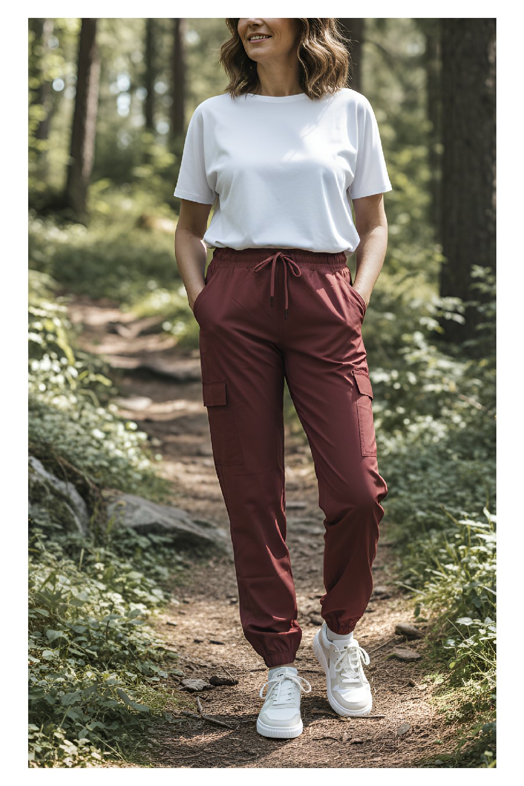 Dámské prodloužené cargo kalhoty jsou ušité z jemného vzdušného a pružného nylonu, který rychle schne. Kalhoty mají bordó barvu. V pase mají gumu a pas lze ho stáhnout šňůrkou. Na přední straně mají 2 funkční kapsy a 2 kapsy na straně v oblasti stehen. Nohavice jsou zakončené do gumy. Kalhoty využijete na procházky, výlety a sport v teplejším počasí.