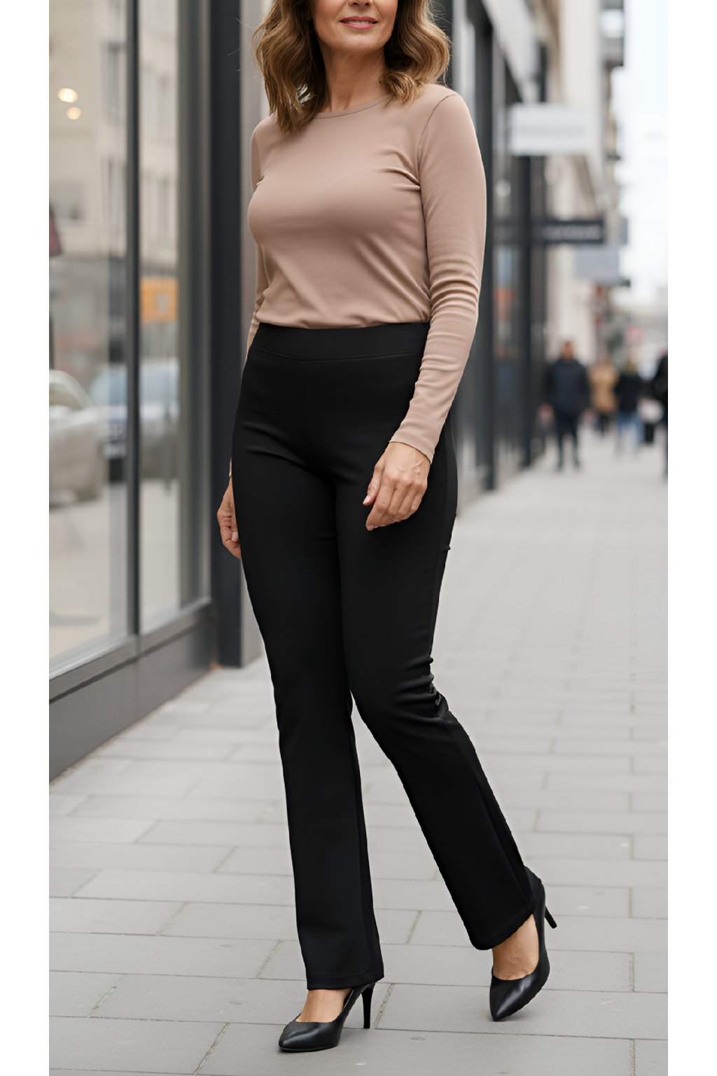 Dámské prodloužené kalhoty Class v černé barvě jsou nadčasovým univerzálním kouskem. Jsou ušity z pevného pružného úpletu vysoké gramáže, který má podpůrnou funkci a zeštíhlující efekt. V pase je všitá 5 cm široká guma. Nohavice mají rovný střih bez vnějších bočních švů a nevytahávají se na nich kolena.
