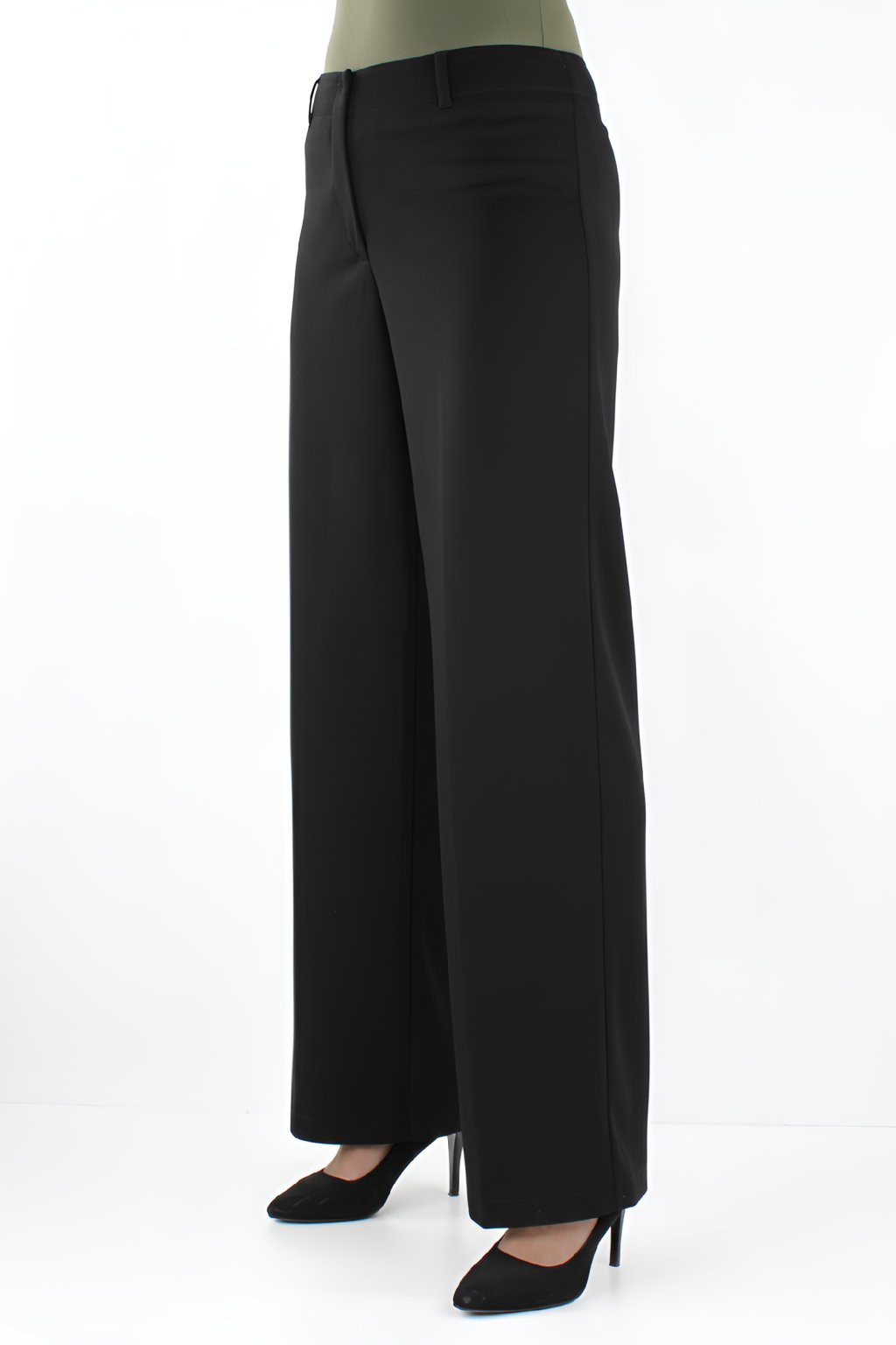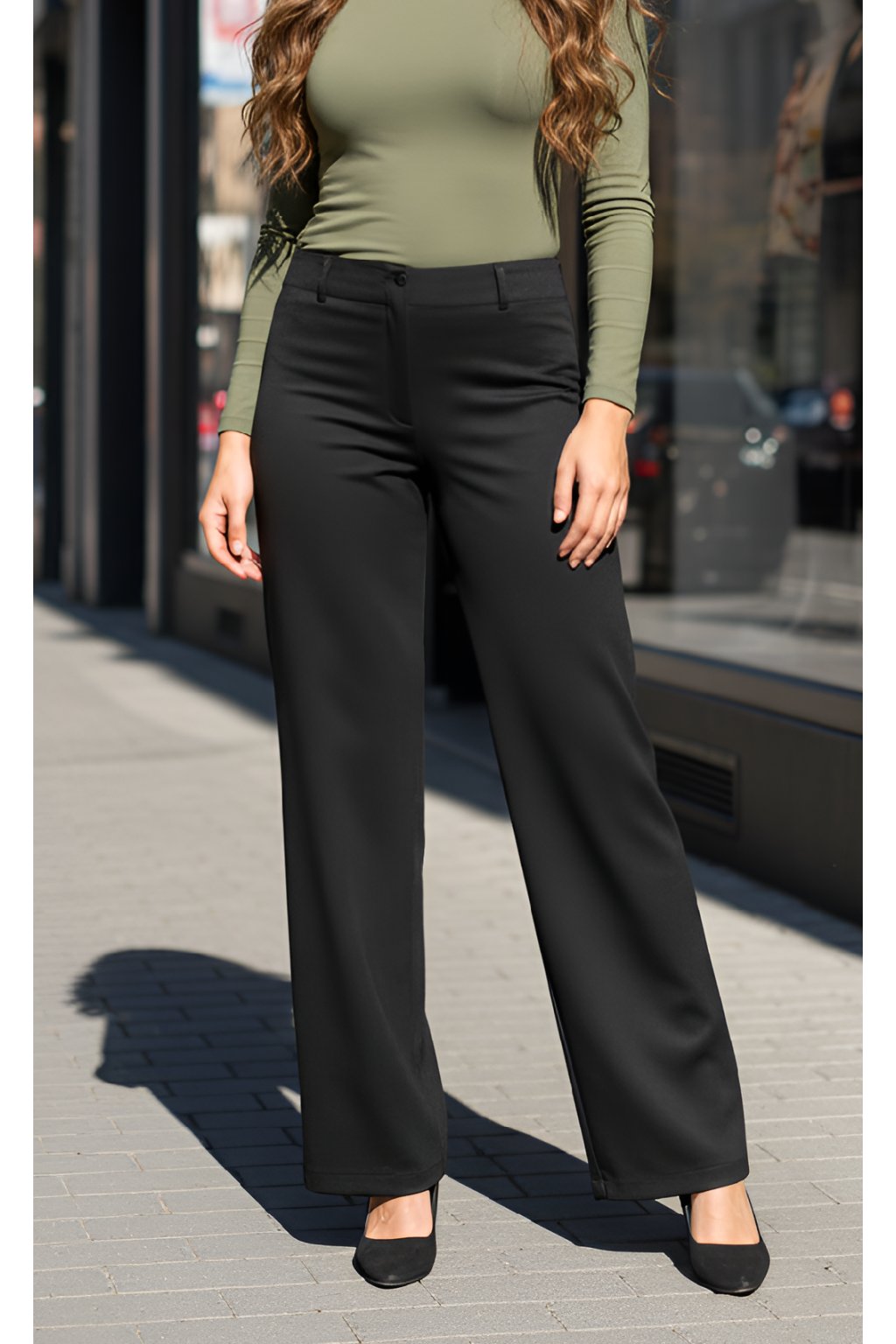 Dámské prodloužené kalhoty CORA v černé barvě jsou ušité z pohodlného kvalitního pružného krásně splývavého jemně lesklého materiálu, díky němuž v nich pohodlně vydržíte celý den. Kalhoty mají široké rovné nohavice a středně vysoký pas. Na zadní straně mají zášivky. Zapínání je na zip a knoflík. V pase jsou poutka na uchycení opasku. Tyto kalhoty jsou klasickým kouskem, který můžete obléct na všechny příležitosti. Jsou vhodné na každodenní nošení do práce i na slavnostní příležitosti.