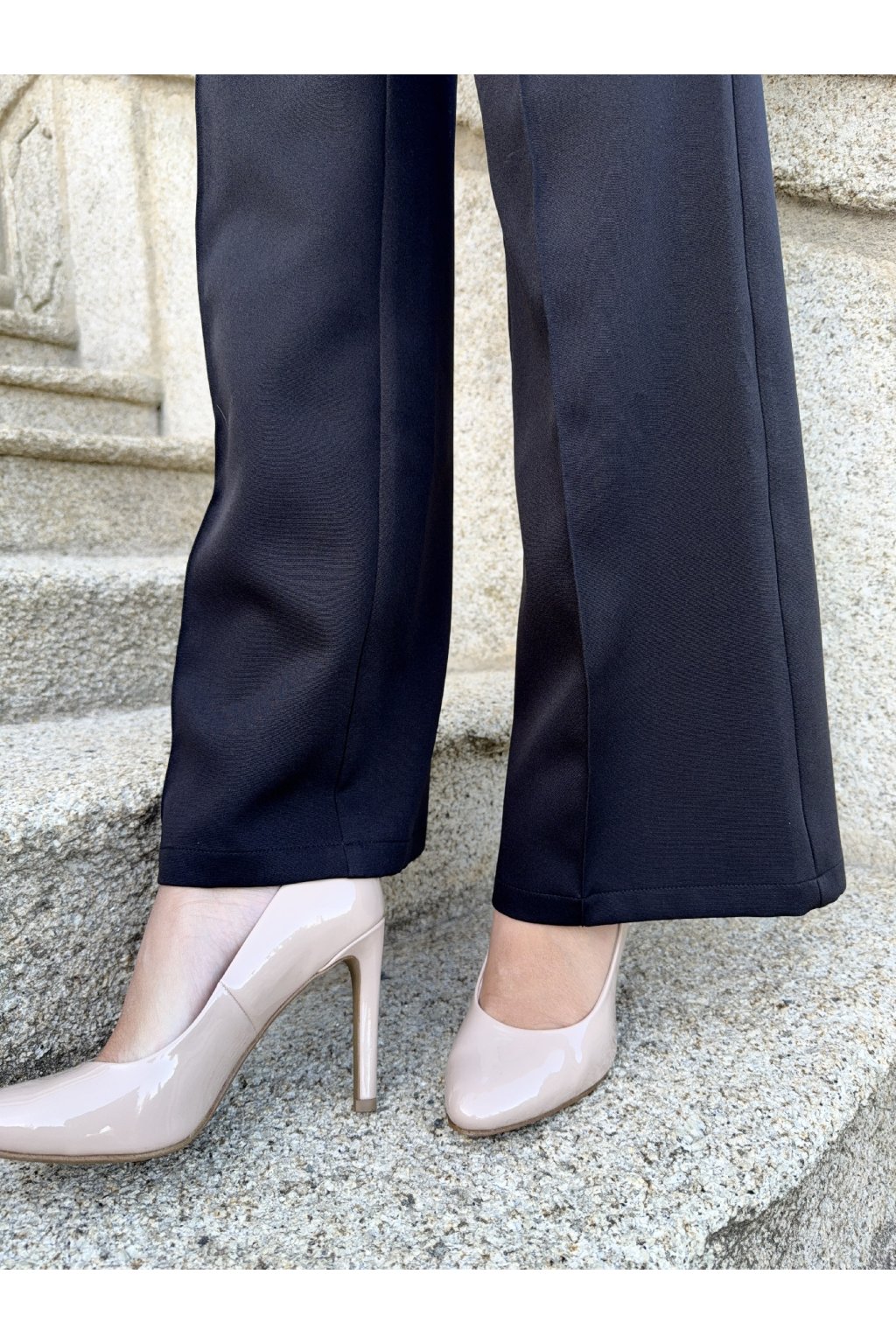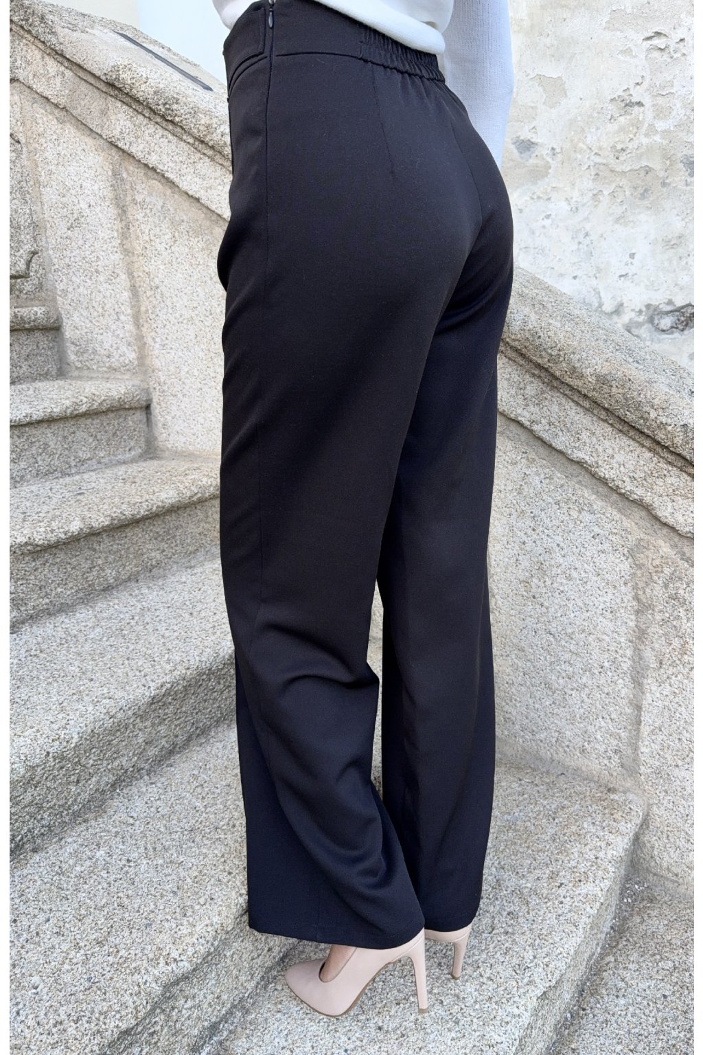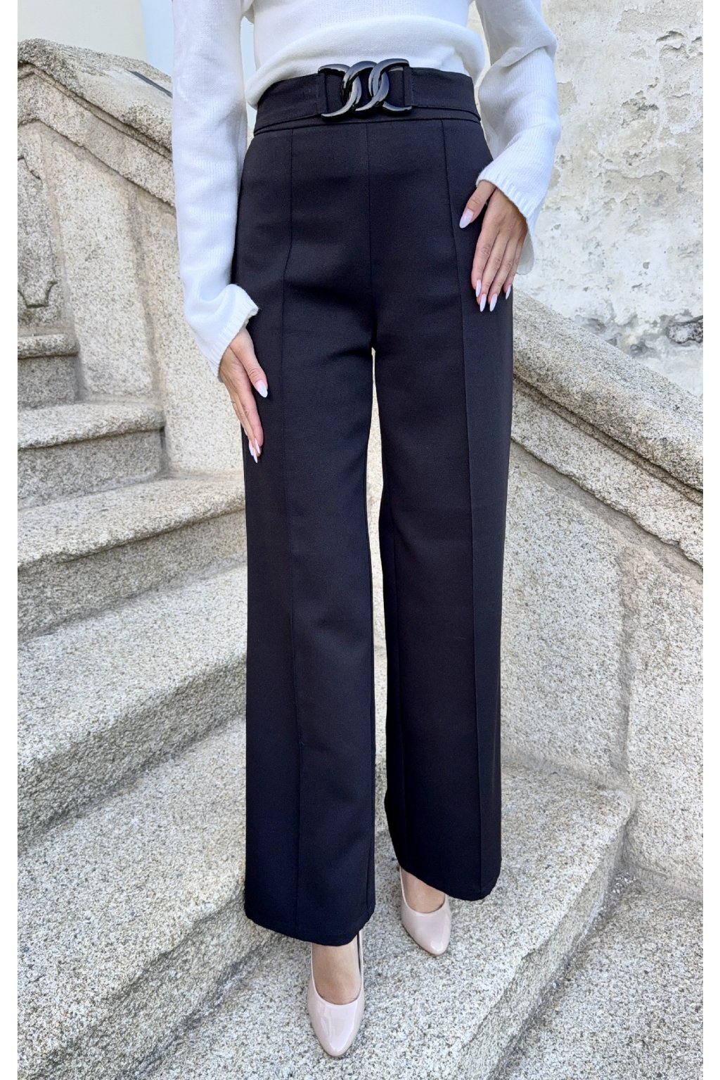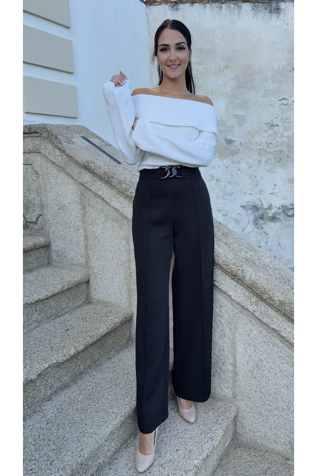 Dámské prodloužené trendy široké kalhoty v černé barvě s výraznou elegantní sponou. Pro větší pohodlí je v části pasu všitá pohodlná guma a na straně je nenápadný zip. Na nohavicích jsou všité puky. Tyto kalhoty vynesete při nejrůznějších příležitostech. Můžete v nich chodit do práce, ale také večer do divadla. Materiál je pevný, splývavý a téměř se nemačká. Vnitřní délka nohavice u všech velikostí je 87 cm.