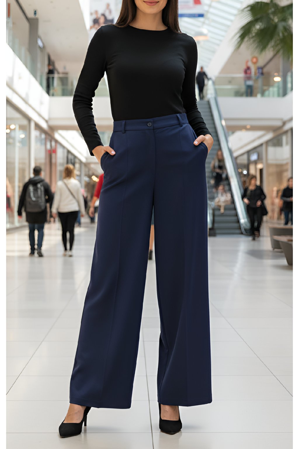 Dámské prodloužené kalhoty Wendy jsou ušité z krásné splývavé kostýmové látky v tmavomodré barvě. Kalhoty mají široký střih nohavic a nažehlené puky. Zapínání je na zip a knoflík. Pro větší pohodlí a vůli je v zadní části kalhot našitá pružná guma. V pase jsou také poutka pro uchycení opasku. Na přední straně jsou dvě kapsy.