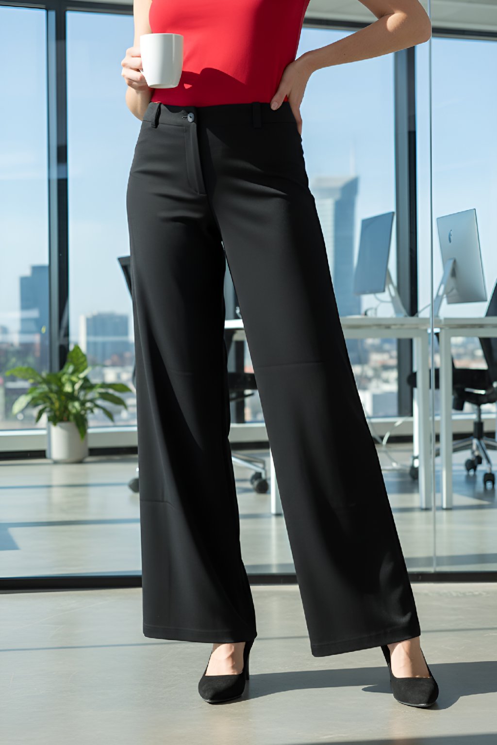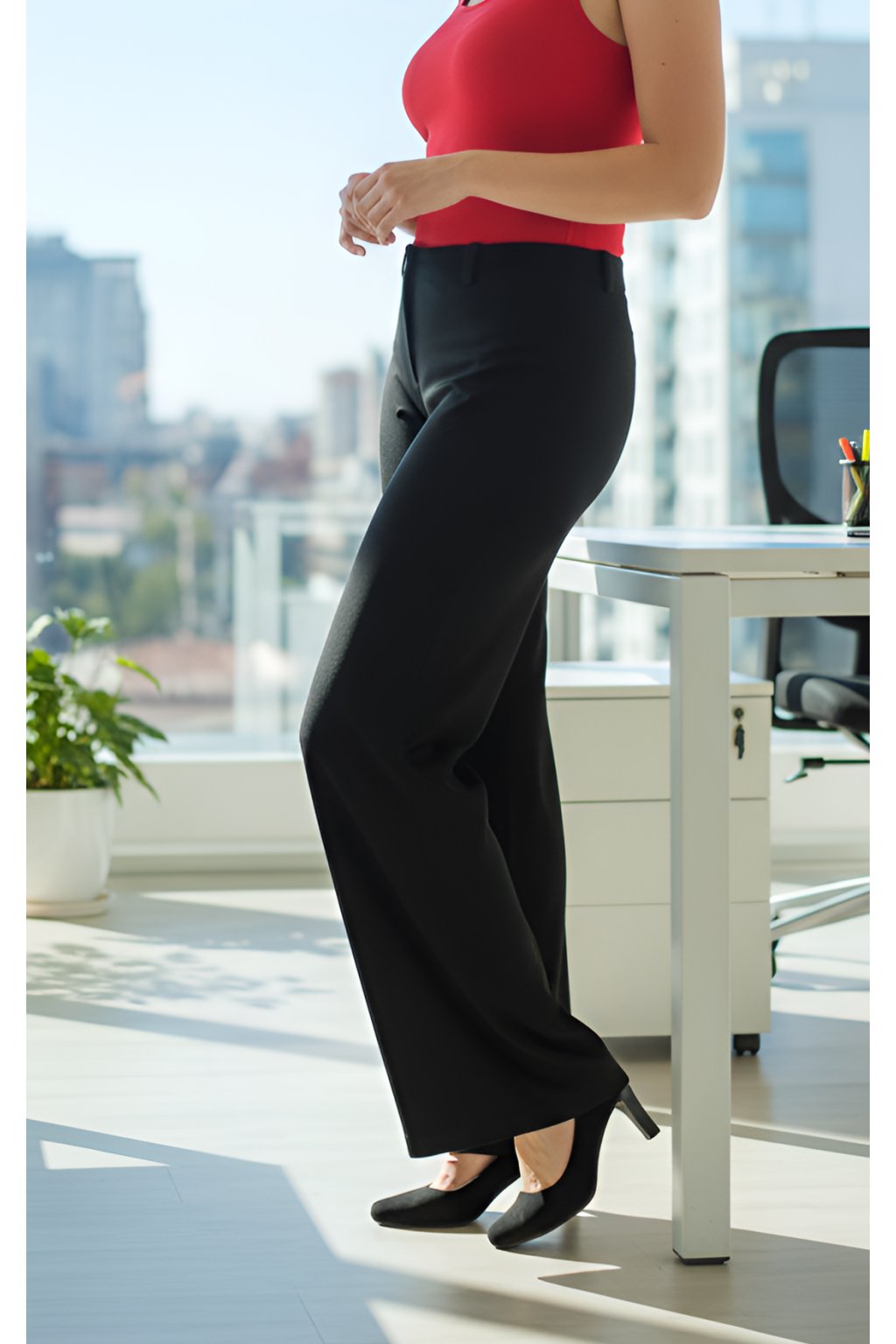 Dámské prodloužené kalhoty z příjemného pohodlného elegantního a pružného kostýmového materiálu mají trendy široké rovné nohavice. Zapíná je na zip a knoflík. V pase mají poutka na opasek. Zadní díl je tvarován sedlem. V práci v nich díky skvělému materiálu vydržíte celý den. Kalhoty se hodí také do společnosti a pro formální příležitosti. Máte-li míry mezi dvěma velikostmi, volte tu menší.