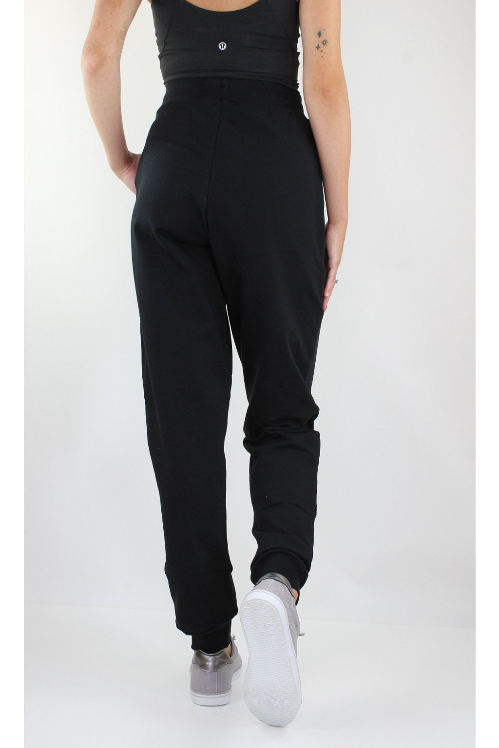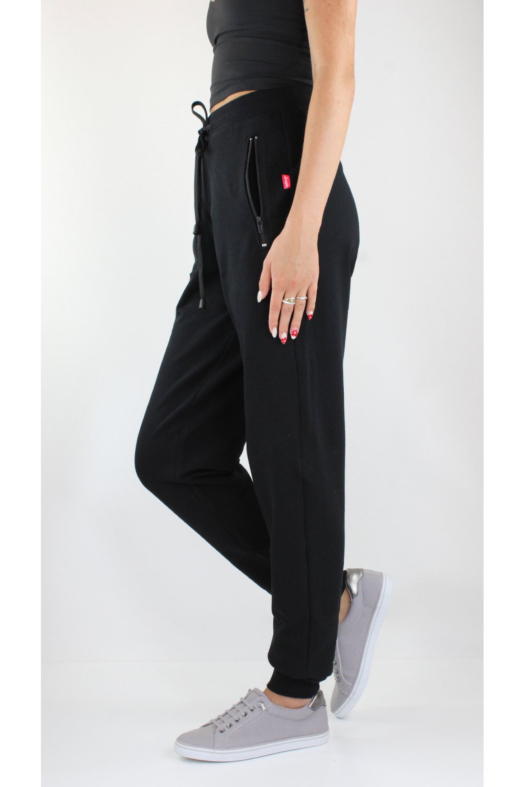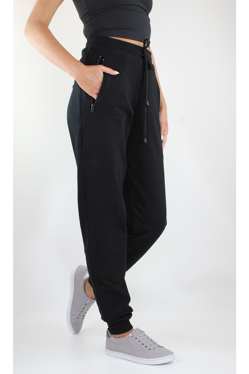 Dámské prodloužené tepláky v černé jsou ušity z kvalitní teplákoviny. Mají dvě přední kapsy na zip a v pase stahovací šňůrku. Nohavice jsou ukončeny manžetou. Tepláky mají klasický střih až do pasu.