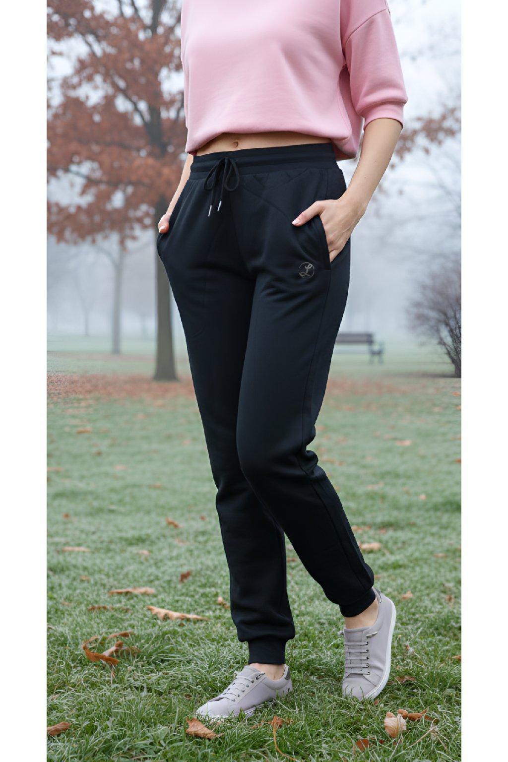 Dámské prodloužené tepláky Debora v černé barvě jsou ušity z měkké příjemné teplákoviny. Mají volnější střih a širší nohavice, které jsou ukončené manžetou. Tepláky jsou pohodlné i pro dámy s širšími lýtky. V pase mají gumu a stahovací šňůrku. Na přední straně jsou dvě funkční kapsy, z nichž jedna je zdobena malý logem.