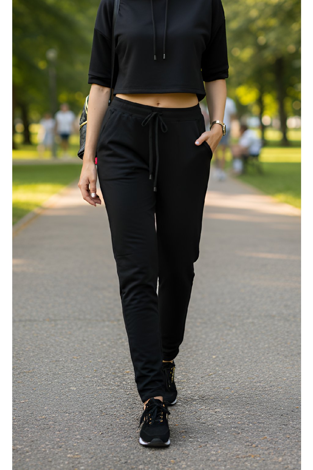 Dámské prodloužené tepláky v černé barvě z velice jemné pružné teplákoviny, která má z vnitřní strany hřejivý chloupek, jsou vhodné do chladnějšího počasí. Tepláky mají dvě přední kapsy, v pase gumu, stahovací šňůrku a nohavice se směrem dolů zužují. Tepláky mají střih až do pasu.