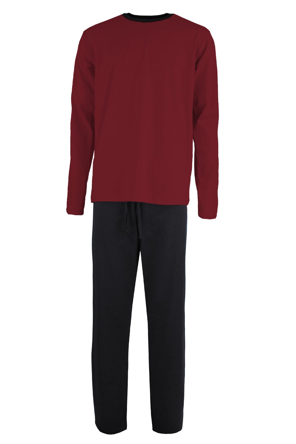 Pánské prodloužené pyžamo je ušité z kvalitního bavlněného materiálu. Triko je ušité ve vínovém odstínu s černým lemem u krku. Kalhoty mají černou barvu jako lem trika. V pase je stahovací šňůrka. Rozměry pyžama naleznete zde níže v detailu produktu.