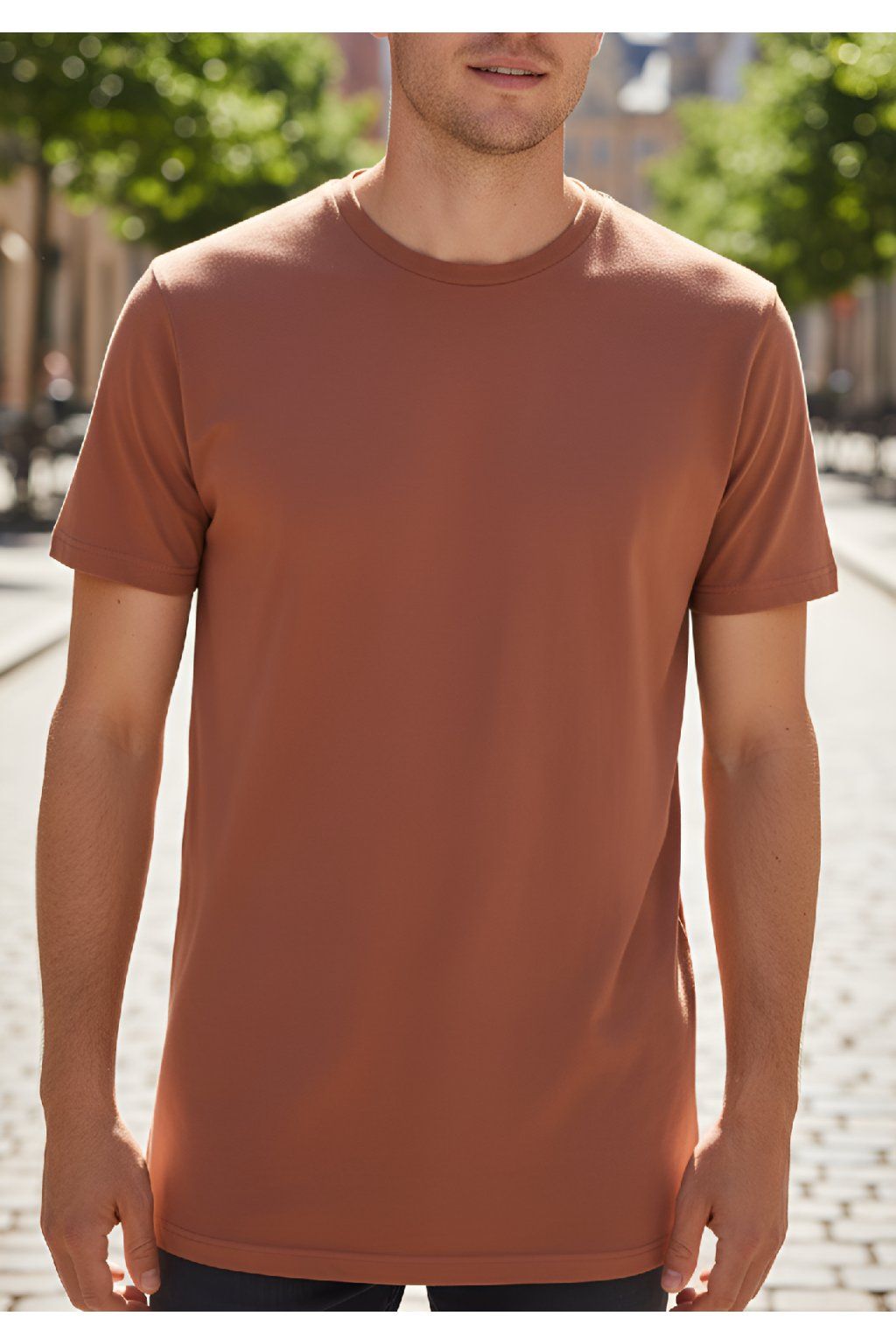 Pánské prodloužené triko v světle skořicové barvě z kvalitního bavlněného materiálu s elastanem. Triko drží tvar a nepřetáčí se ve švech. Triko je bez potisku. Triko je k dispozici ve dvou délkách LONG a EXTRA LONG.
