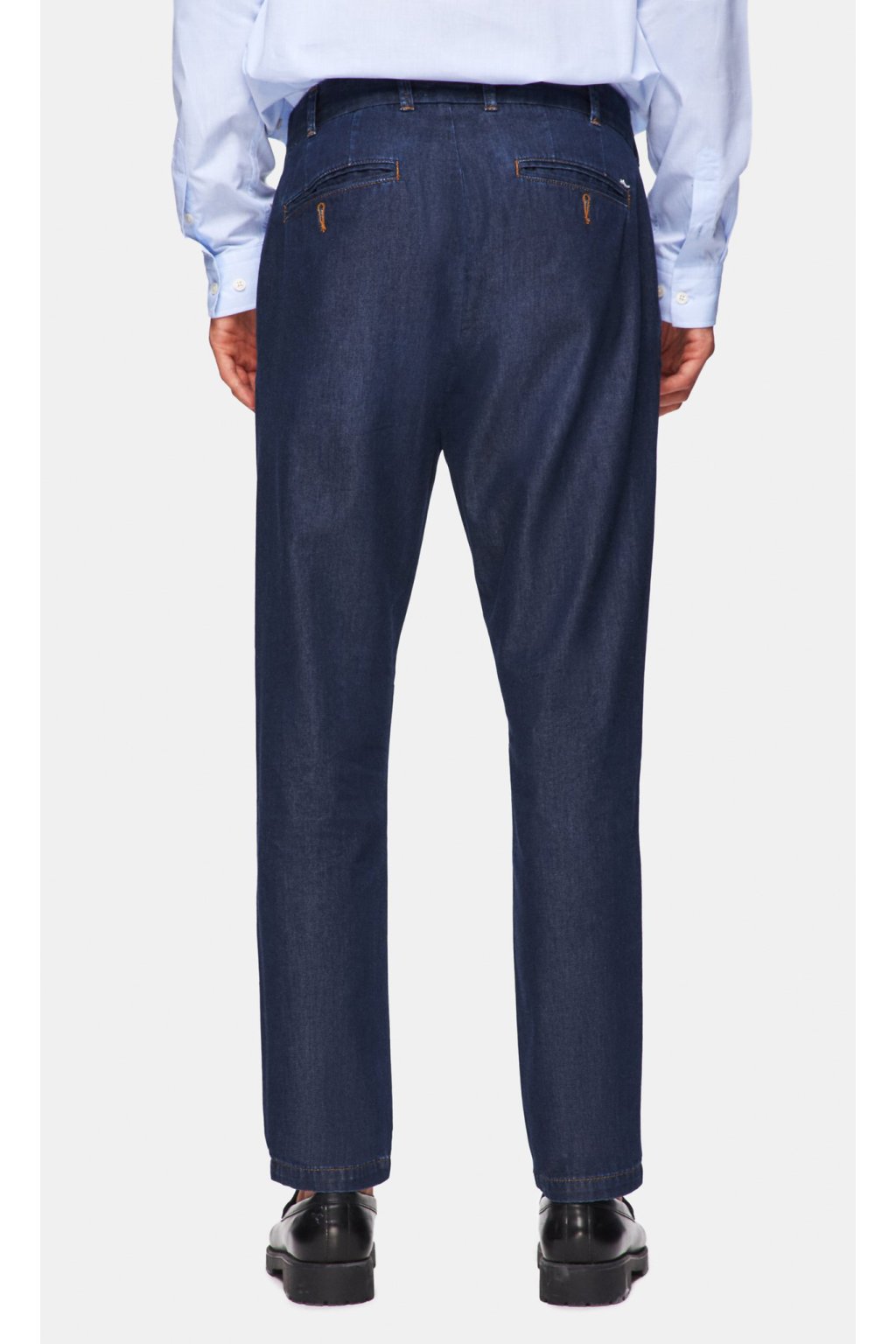 Pánské prodloužené plátěné chino kalhoty jsou ušity z lehkého vzdušného materiálu džínového vzhledu. Kalhoty mají dvě přední funkční kapsy a dvě zadní funkční kapsy se zapínáním na knoflík. Kalhoty mají středně vysoký pas a celkové zapínání je na zip a knoflík. Tyto kalhoty mají neotřelý styl a jsou velmi pohodlné, vhodné do práce i volný čas.
