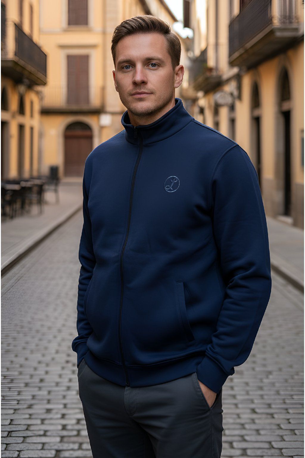 Pánská prodloužená mikina v modré barvě z měkkého materiálu, který má z vnitřní strany hřejivý chloupek. Na přední straně jsou dvě kapsy na zip. U krku je stojáček. Zapínání mikiny na zip.