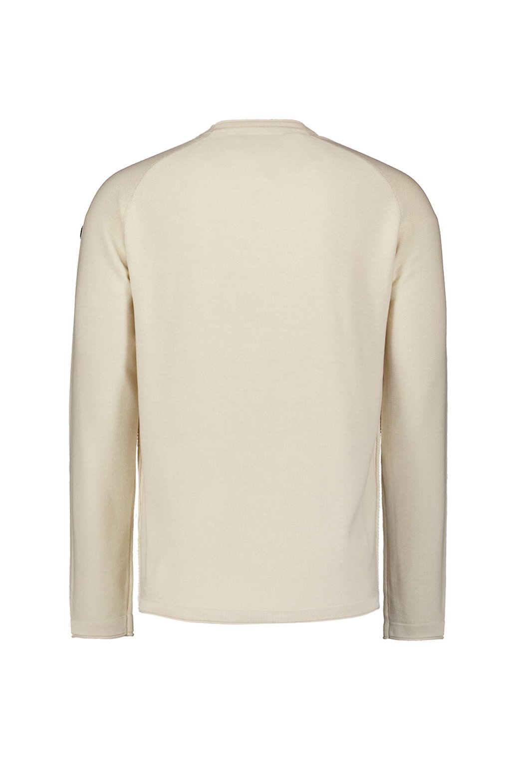 Pánský prodloužený elegantní svetr v krémové barvě se zajímavým šikmým pleteným vzorem, který se sbíhá uprostřed a vytváří tak středový obrazec je ušitý z měkké, příjemné pleteniny, která nežmolkuje. Svetr má raglánové rukávy.