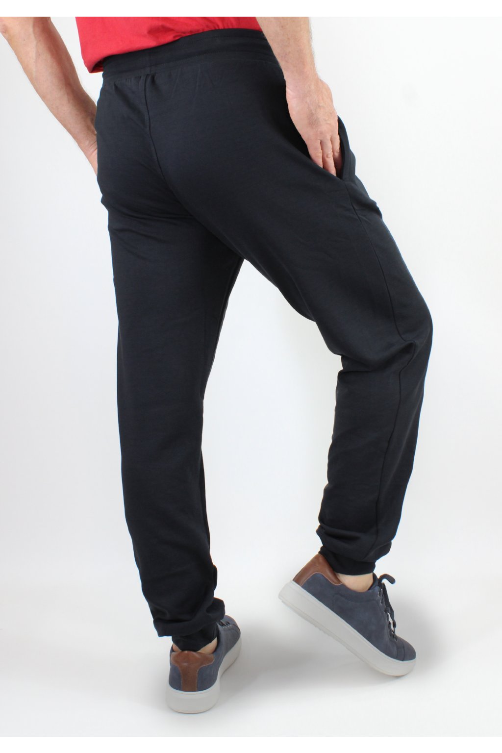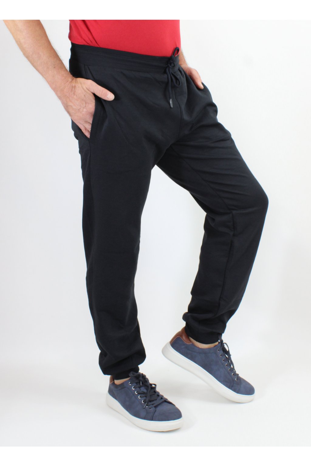 Pánské prodloužené tepláky v černé barvě jsou ušity z pohodlné pružné hladké teplákoviny. Na přední straně mají dvě kapsy, v pase je guma a stahovací šňůrka. Nohavice mají širší střih a jsou ukončené manžetou.