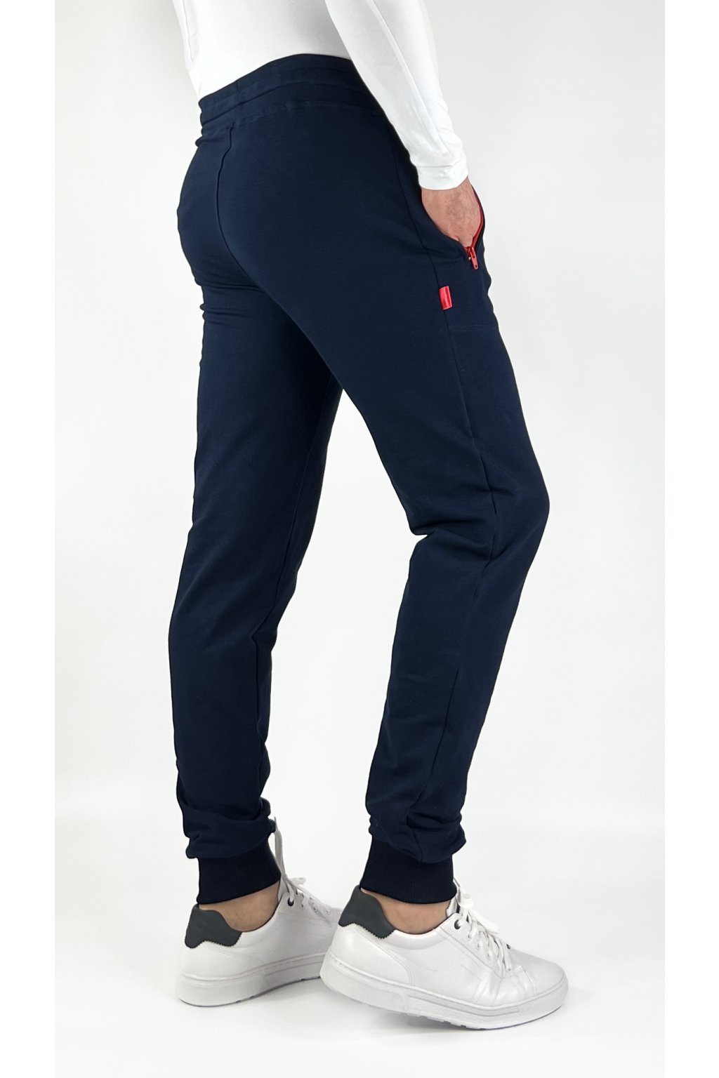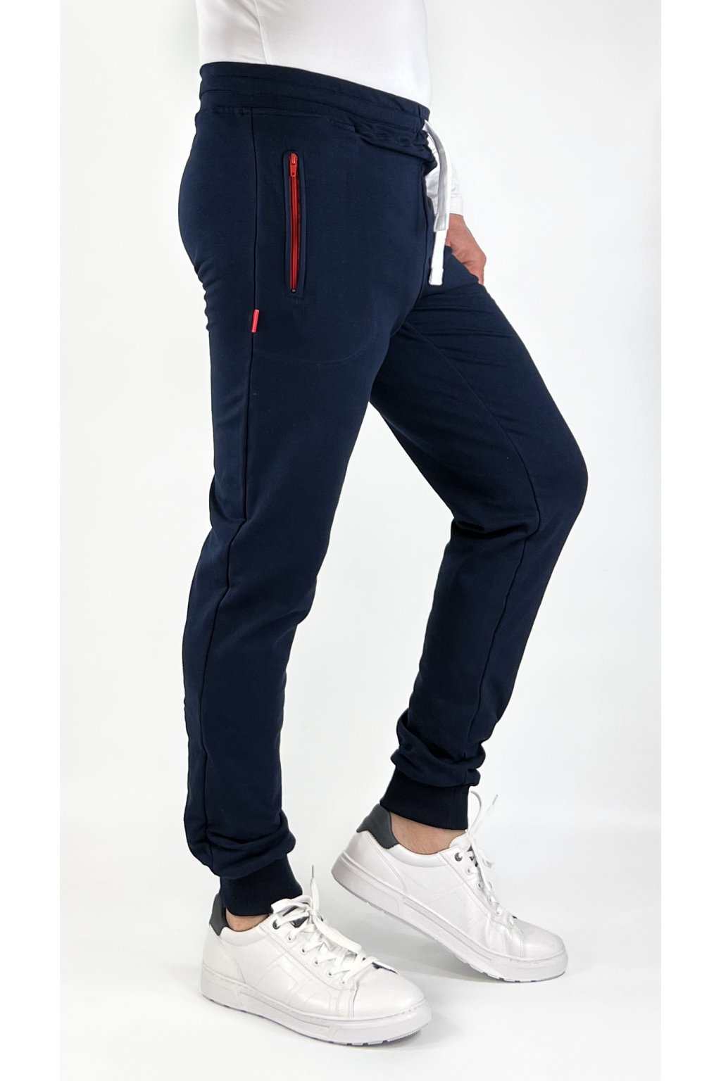 Pánské prodloužené tepláky v tmavomodré barvě jsou ušity z pružné teplákoviny. Na přední straně mají 2 kapsy s červeným zipem. Nohavice jsou úzké typu SLIM a zakončené manžetou. V pase mají gumu a bílou stahovací šňůrku.