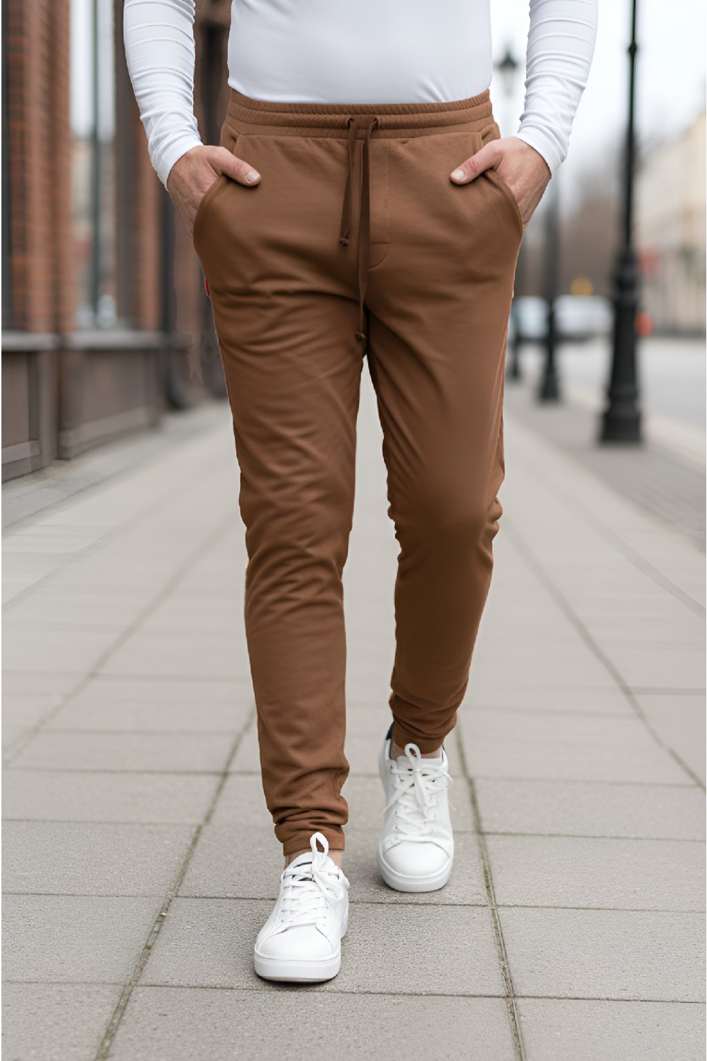 Pánské prodloužené tepláky s jemným chloupkem z vnitřní strany ve skořicovém odstínu jsou ušity z velice příjemné měkké teplákoviny. Na přední straně mají dvě kapsy, v pase gumu a stahovací šňůrku. Tepláky mají středně široké nohavice.