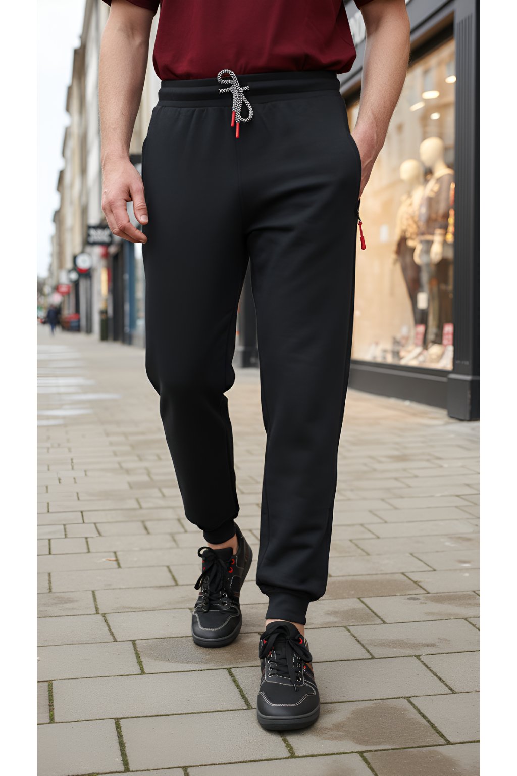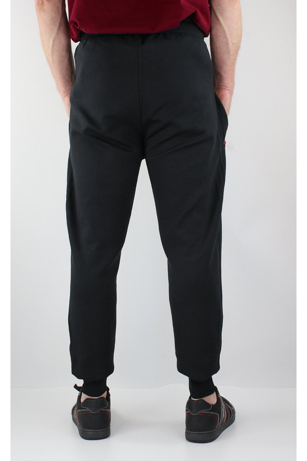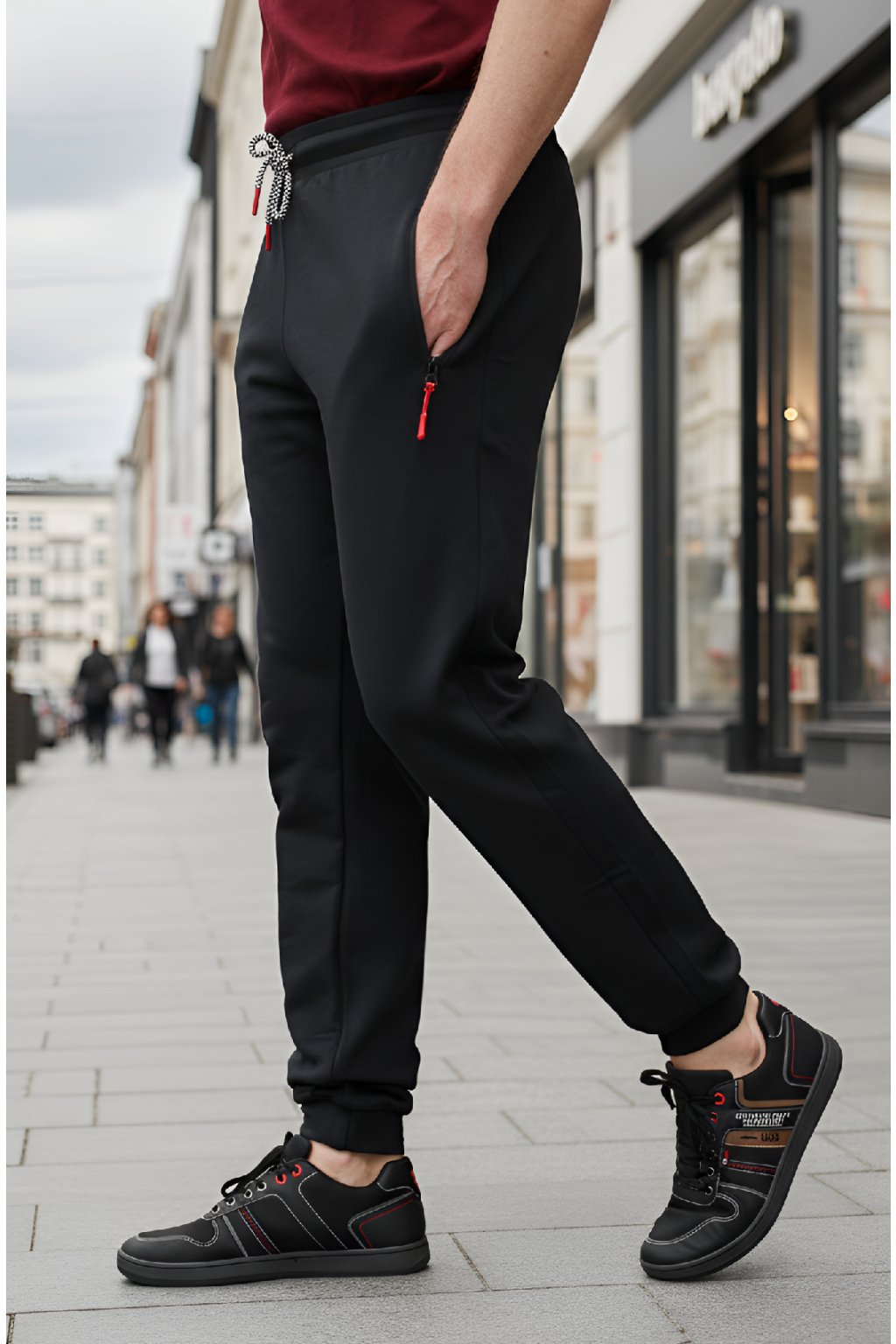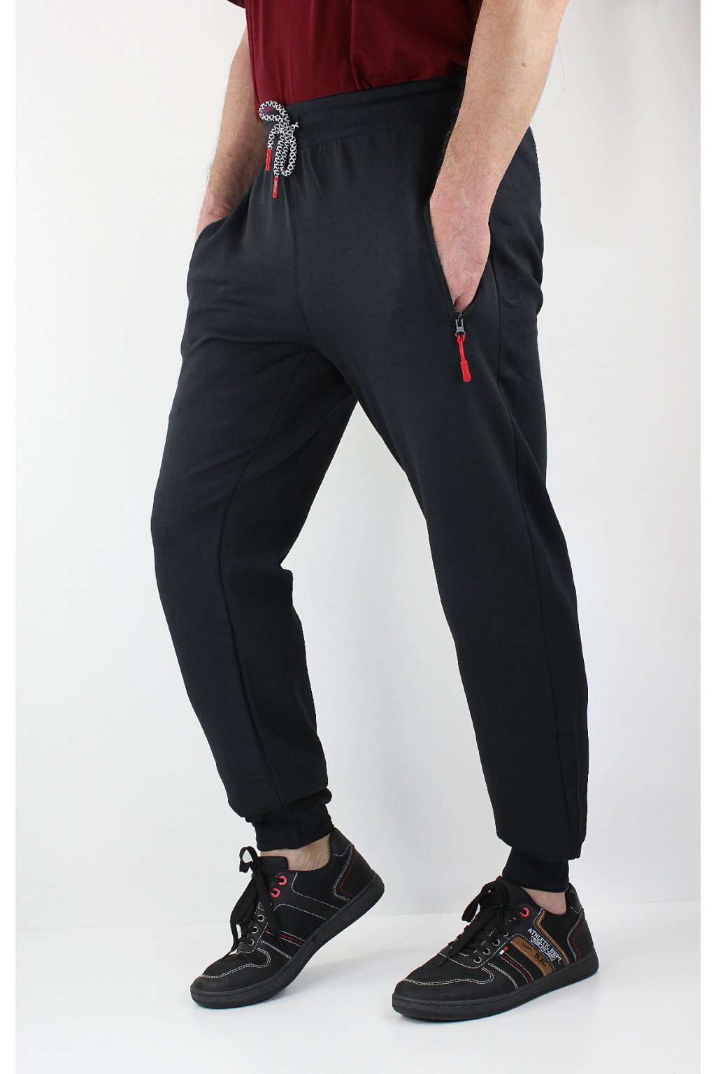 Pánské prodloužené tepláky v černé barvě jsou ušity z pohodlné pružné hladké teplákoviny. Na přední straně mají dvě kapsy na zip, v pase je guma a stahovací šňůrka. Nohavice mají středně široký střih a jsou ukončené manžetou.