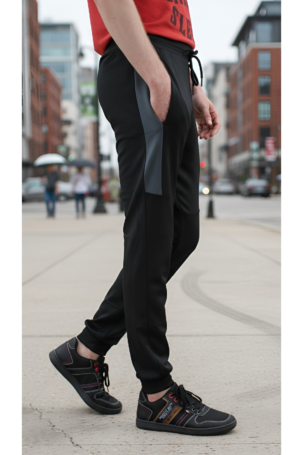 Pánské prodloužené tepláky v černé barvě s postranním šedým pruhem jsou ušity z pohodlné pružného materiálu. Na přední straně mají dvě kapsy, v pase je guma a stahovací šňůrka. Nohavice jsou ukončené manžetou.