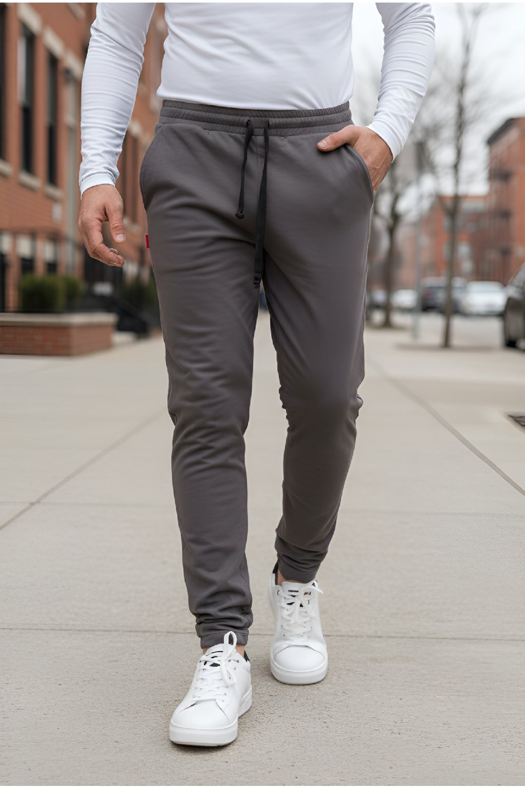 Pánské prodloužené tepláky s jemným chloupkem z vnitřní strany v šedohnědém odstínu jsou ušity z velice příjemné měkké teplákoviny. Na přední straně mají dvě kapsy, v pase gumu a stahovací šňůrku. Tepláky mají středně široké nohavice.